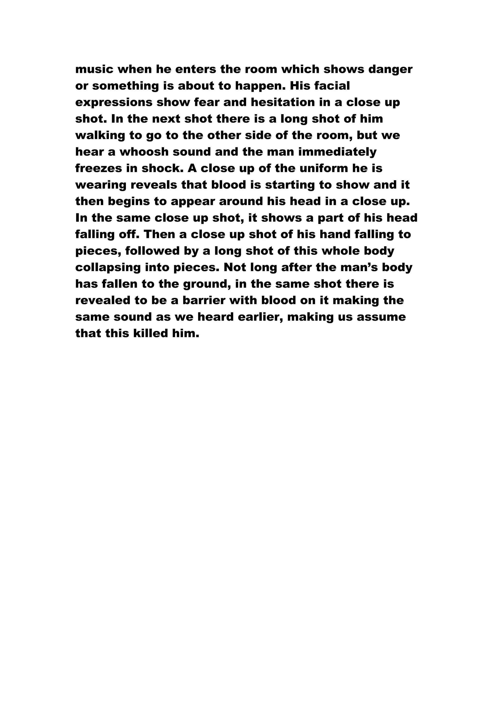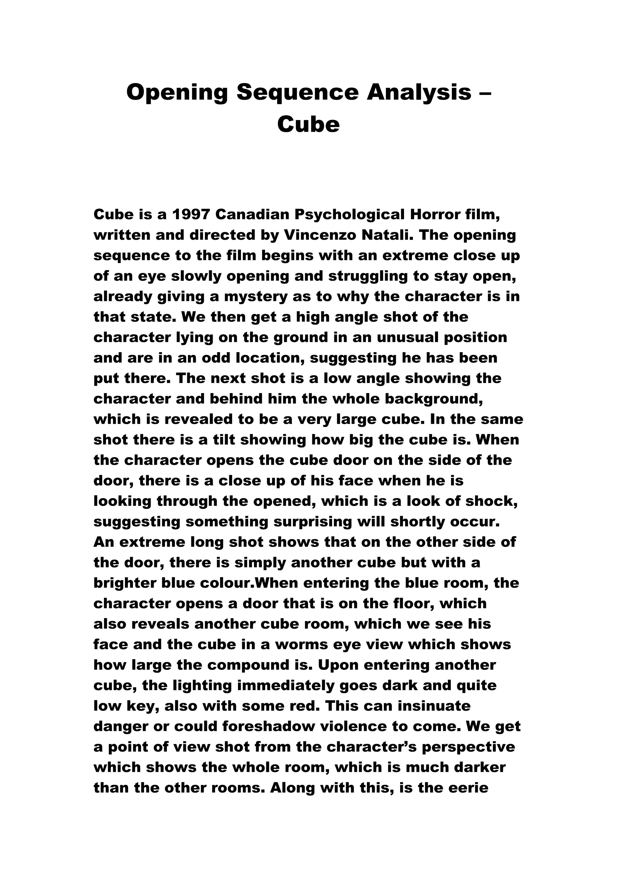 The opening sequence of the film Cube begins with an extreme close-up of a character's eye opening in an unusual position inside a large cube structure. As the character explores the cube, he discovers identical cube rooms connected by doors in the floors and walls. Upon entering a darker cube room, ominous music plays and the character becomes fearful. A loud whooshing sound is then heard, and the character is suddenly killed as his body violently disintegrates and collapses onto the floor. It is revealed that an invisible barrier in the room was the source of the sound and caused his death.