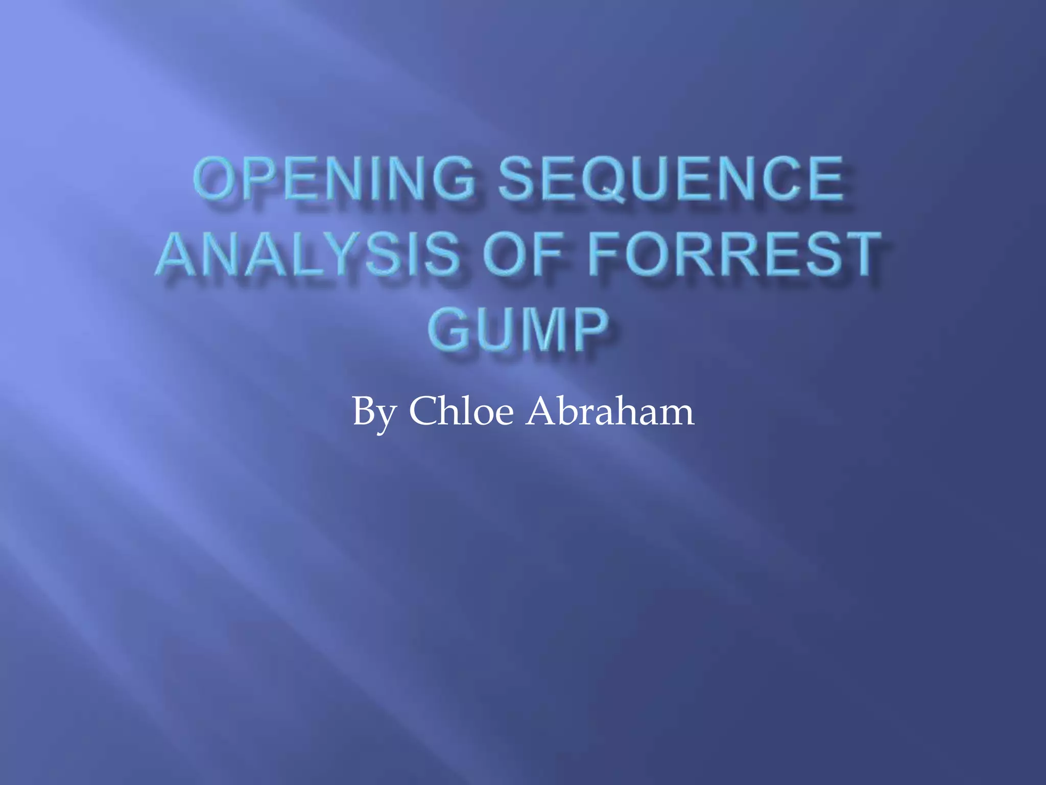 The document provides an analysis of the opening sequence of the film Forrest Gump. It notes that the sequence follows a white feather as it floats through a town and lands at the feet of Forrest Gump. It analyzes the cinematography, lighting, music, costumes, and props in the opening scene. The feather is identified as the most important visual element, representing ideas of fate, destiny, freedom, and Forrest Gump himself.