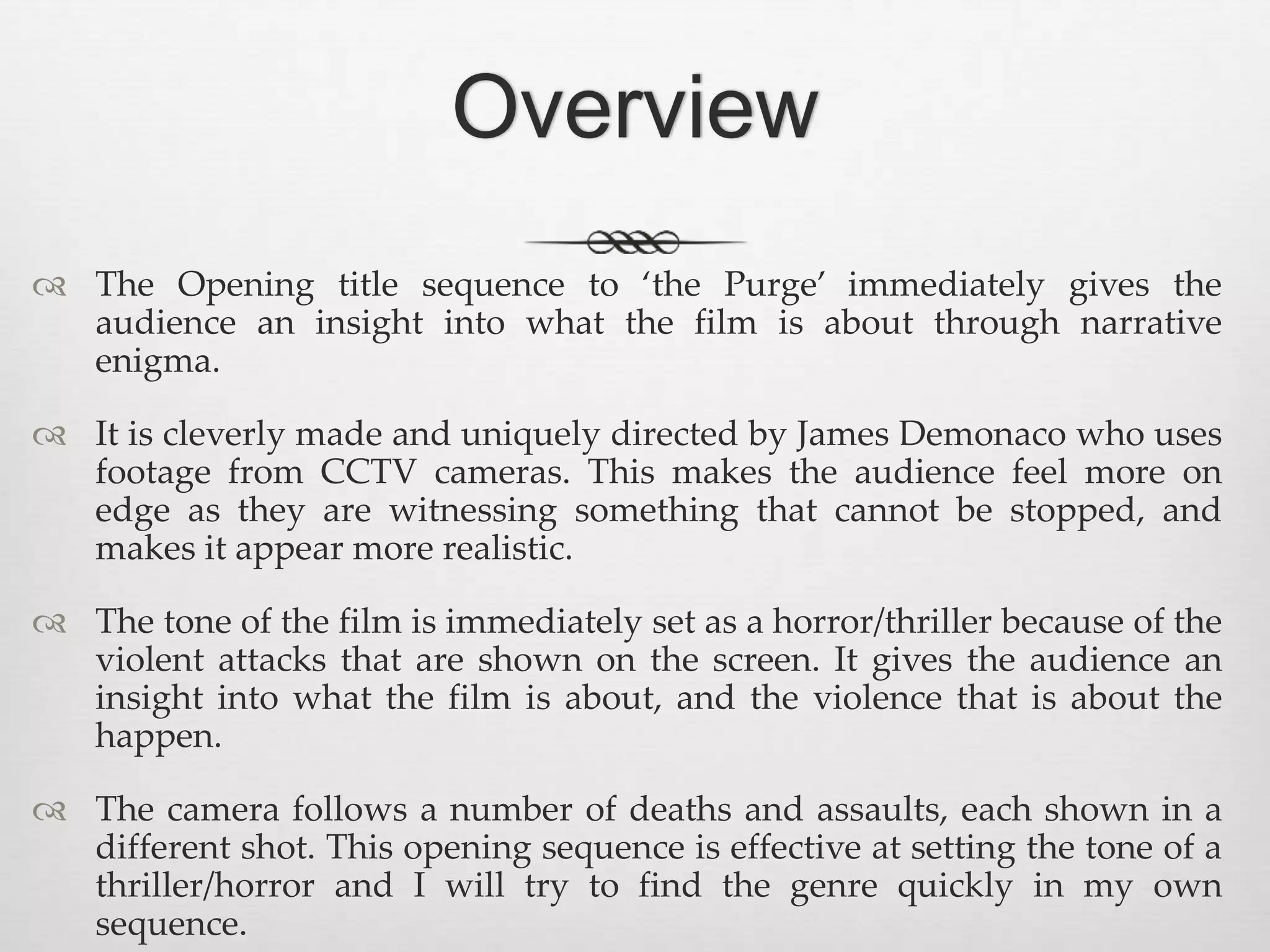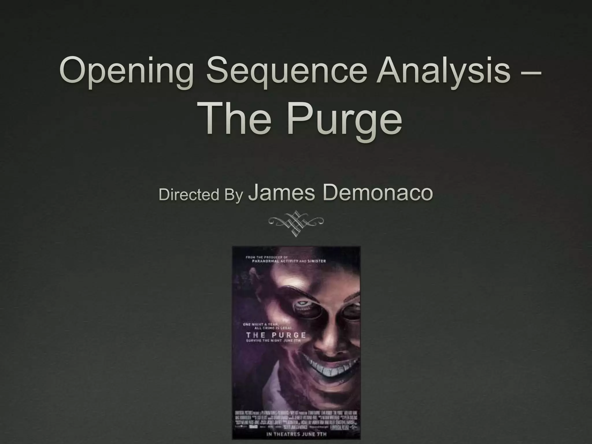 The document analyzes and summarizes the opening title sequence of the film "The Purge". It notes that the sequence uses CCTV footage to set an unsettling tone and establish the horror/thriller genre. Various film techniques like editing, music, and camera work are discussed to show how they build tension and mystery for the audience. The purpose of an effective title sequence is also addressed.