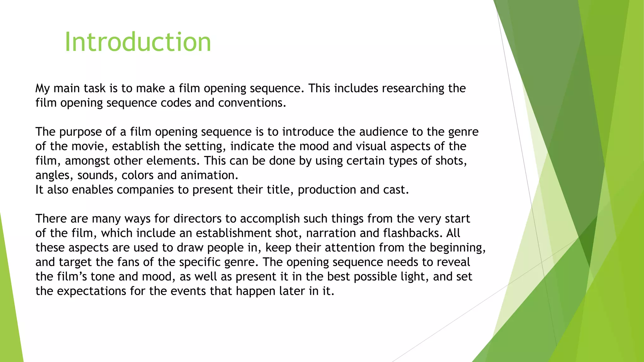 This document discusses the codes and conventions of film opening sequences. It explains that opening sequences are meant to introduce the genre, establish the setting and mood, and present production details like the studio and cast. Common elements that are discussed include establishing shots, titles, narration, sound, animation, credits and flashbacks. The purpose is to draw in the audience and set expectations for the film. Specific techniques like genre establishment, character introduction, themes and enigma are examined.