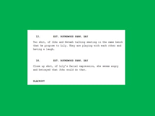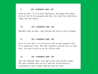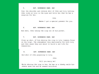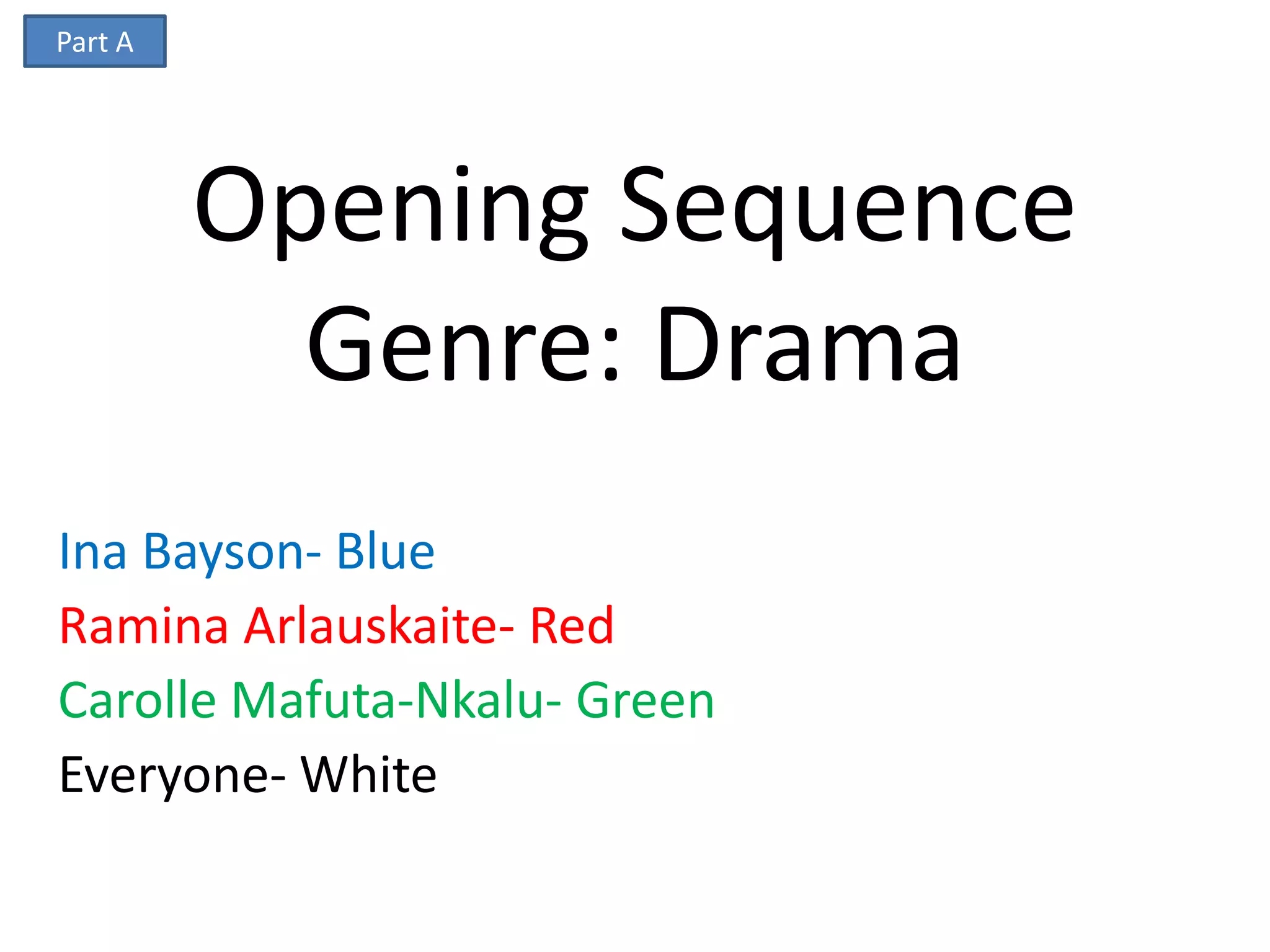 The document provides details for an opening sequence for a drama film. Part A establishes the genre as drama. Part B includes brainstorms from three writers - Ramina, Carolle, and Ina - for the opening sequence. Ramina's idea involves jealousy and bullying between girls over a boy. Carolle's uses flashbacks and flash-forwards. Ina's introduces a proposal and subsequent flash-forward of the girlfriend stalking her boyfriend with another girl. Part C discusses conventions of the drama genre. Part D provides an example of an inspirational drama film. Part E discusses choosing themes and brainstorming ideas for the opening sequence.