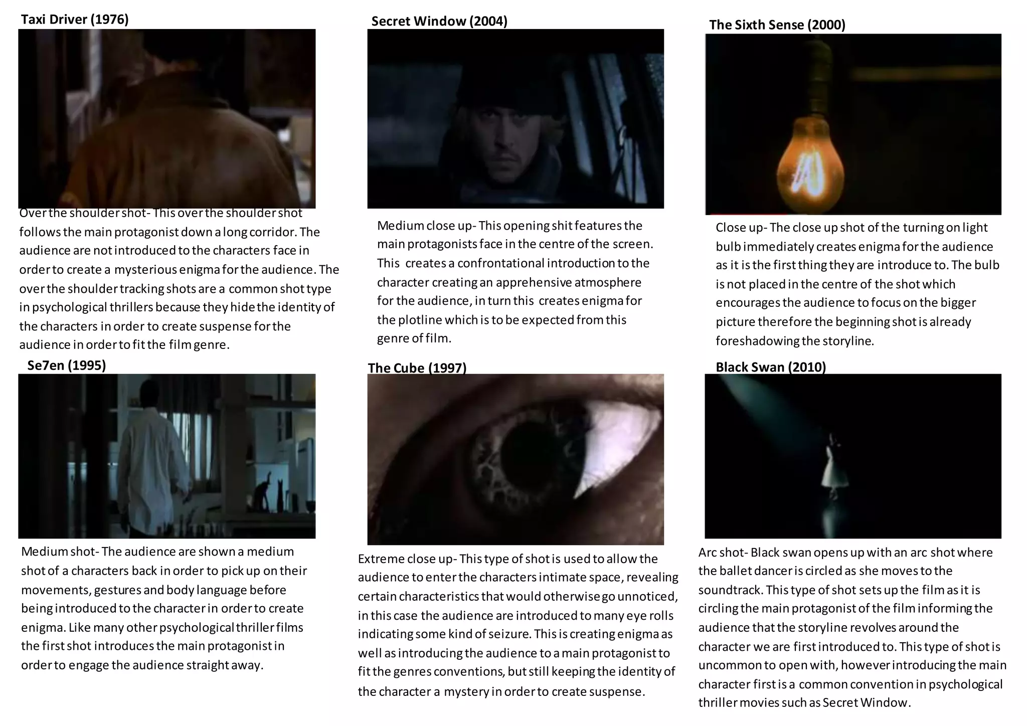 This document discusses various camera shot types that are commonly used in psychological thriller films to create mystery, suspense and introduce characters and plotlines in an enigmatic way. It provides examples of how over-the-shoulder shots, arc shots, extreme close-ups, medium shots, close-ups and medium close-ups have been effectively utilized in the openings of films like Black Swan, The Sixth Sense, Secret Window, The Cube and Se7en to hide characters' identities, focus on their movements and subtly foreshadow storylines, engaging audiences and setting the tone for these suspenseful genres.