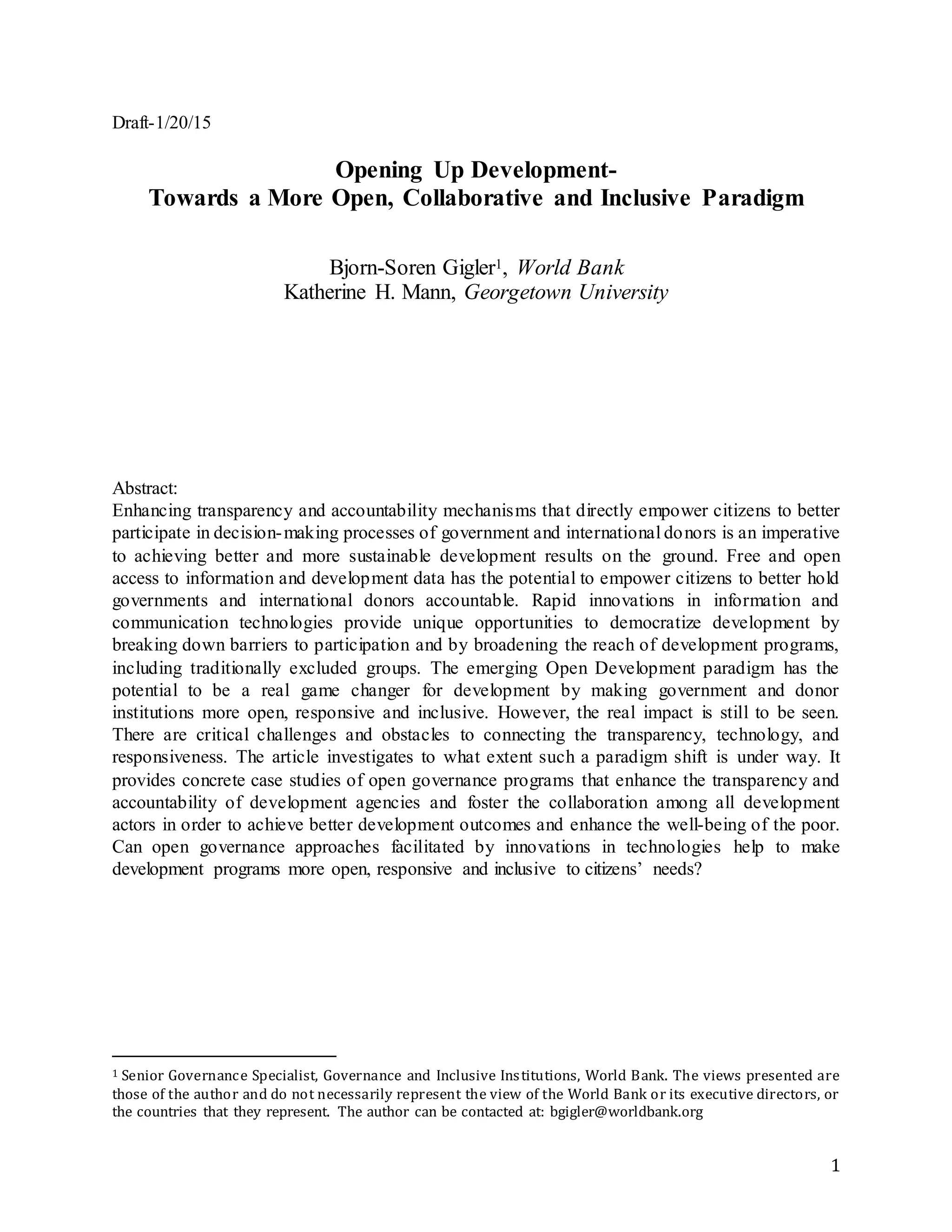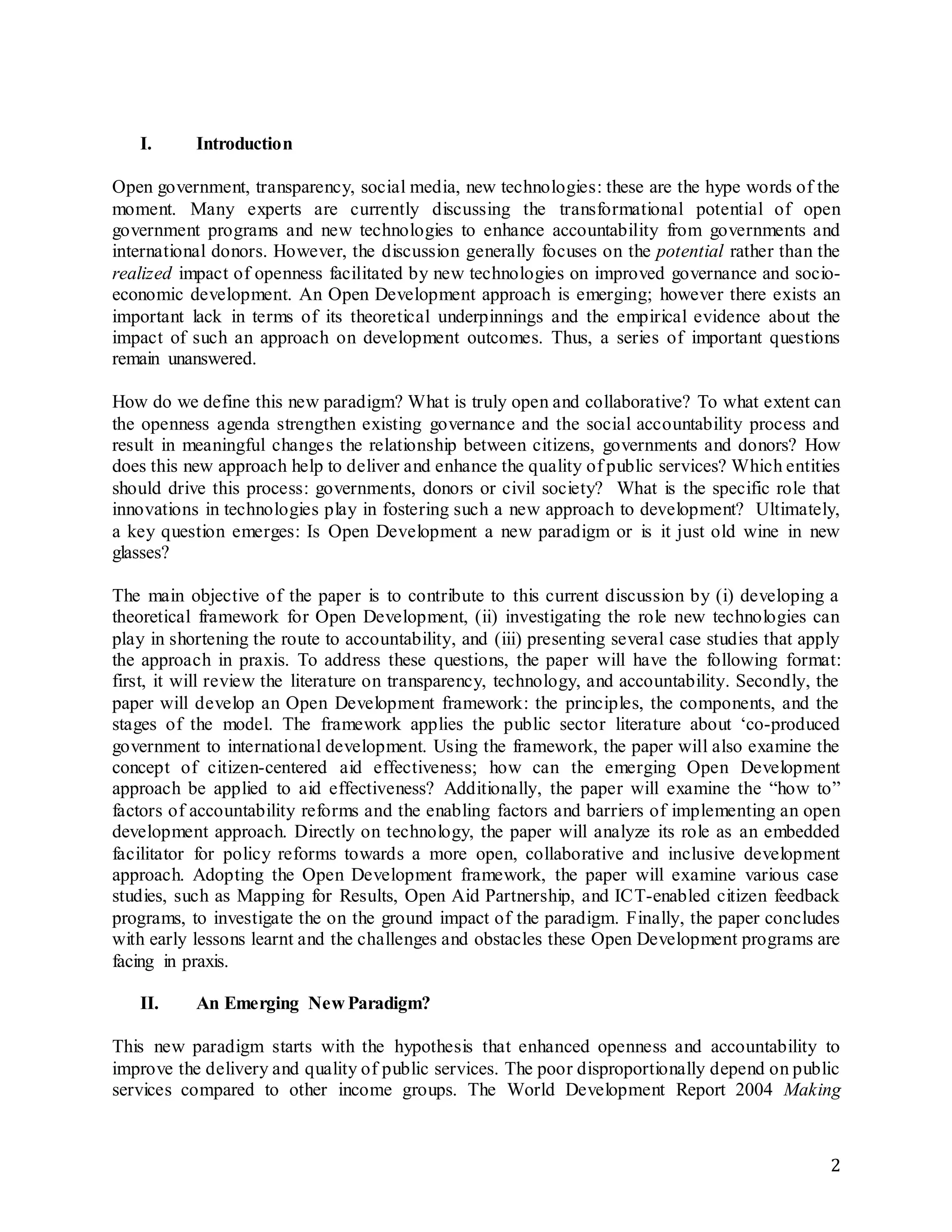 The document discusses the emerging open development paradigm that enhances transparency and accountability by leveraging technology to empower citizens in decision-making processes. It examines the role of open governance programs in improving development outcomes and poses critical questions regarding the effectiveness and theoretical underpinnings of this approach. By analyzing case studies and outlining a framework for open development, the paper aims to address challenges and opportunities in fostering a more inclusive and responsive development landscape.