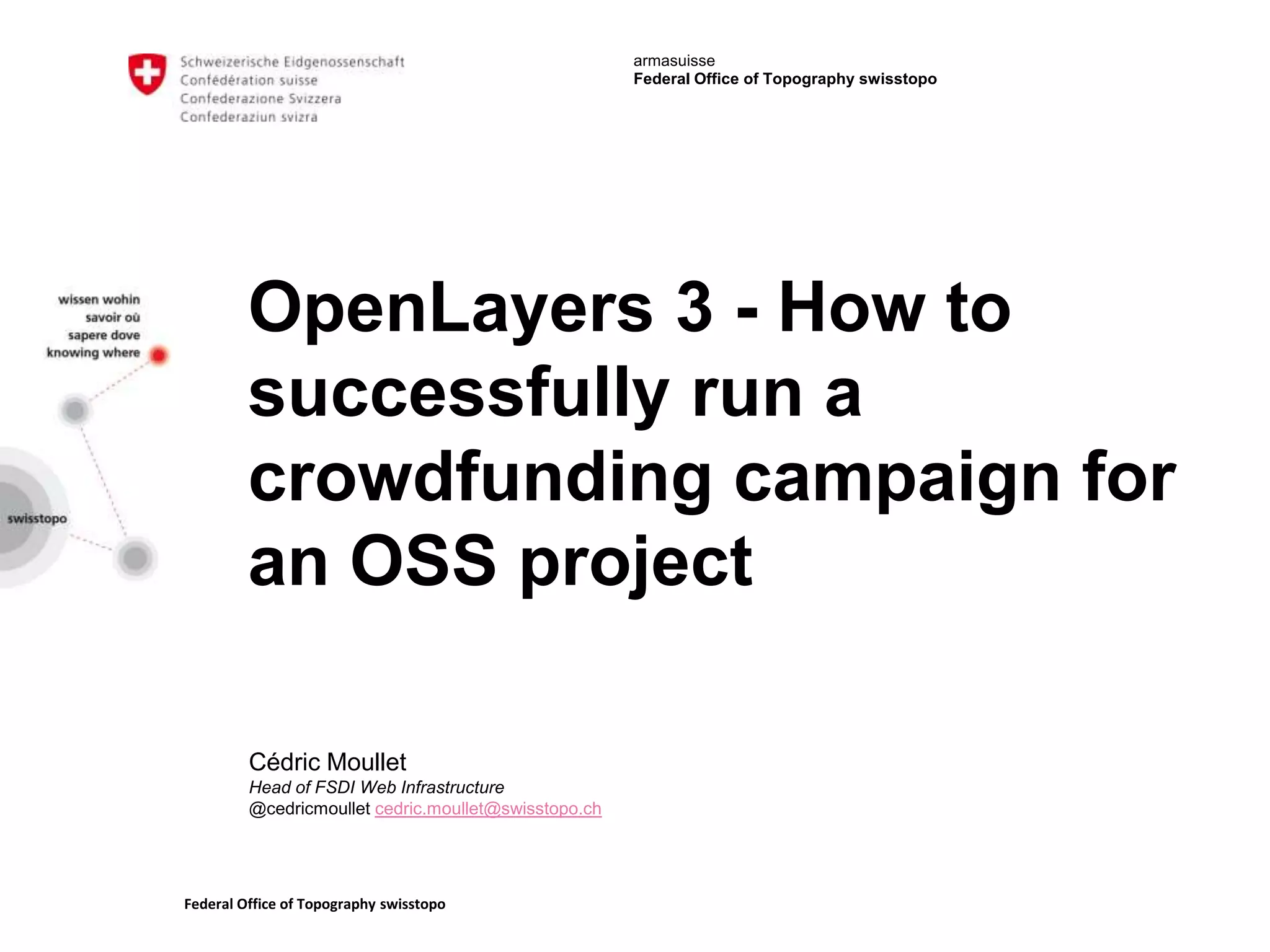3. The document outlines how the Swiss Federal Office of Topography successfully used a community-oriented model to crowdfund 350,000 USD to develop OpenLayers 3, an open source web mapping library.