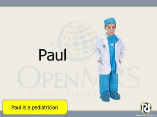 OpenMRS is a collaborative project initiated by Indiana University and Moi University to address the HIV/AIDS epidemic in Kenya through an electronic medical record (EMR) system. It focuses on community-based development, active transparency, and the reuse of existing technologies to improve healthcare delivery. The project emphasizes the importance of patient-centered care and iterative development, resulting in scalable implementations across multiple sites.