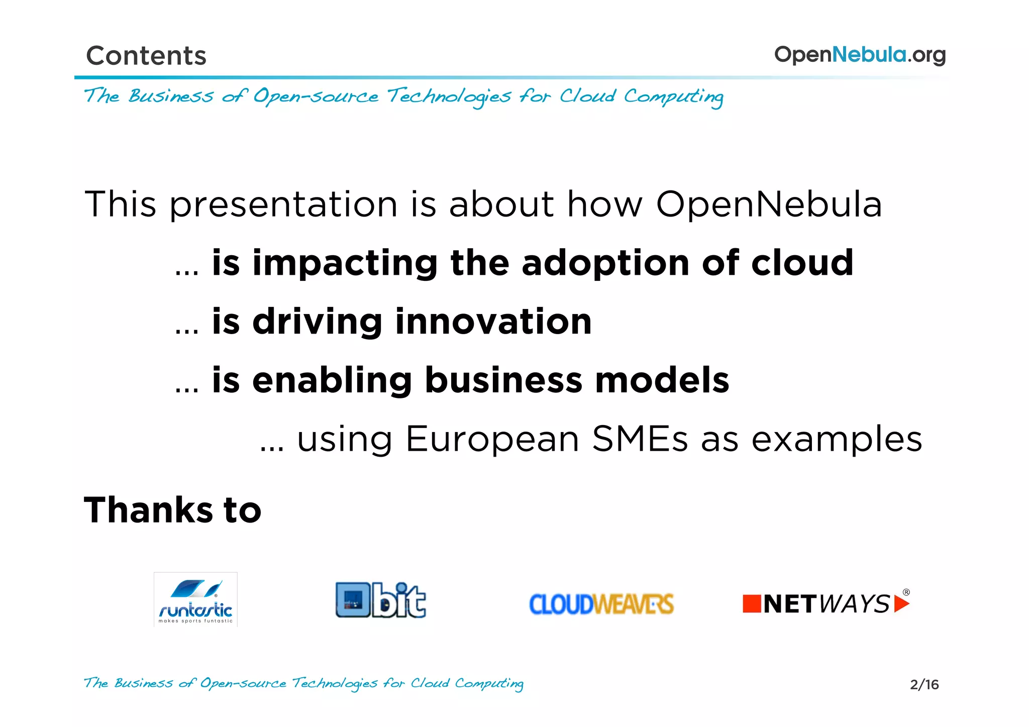 The document presents OpenNebula as a robust open-source platform for building cloud infrastructures, highlighting its impact on business models and innovation, particularly for European SMEs. It emphasizes advantages like cost-effectiveness, flexibility, and community support, which facilitate the development of private and public cloud services. Through various examples, it showcases how businesses have successfully utilized OpenNebula to enhance their operations and foster new service offerings.