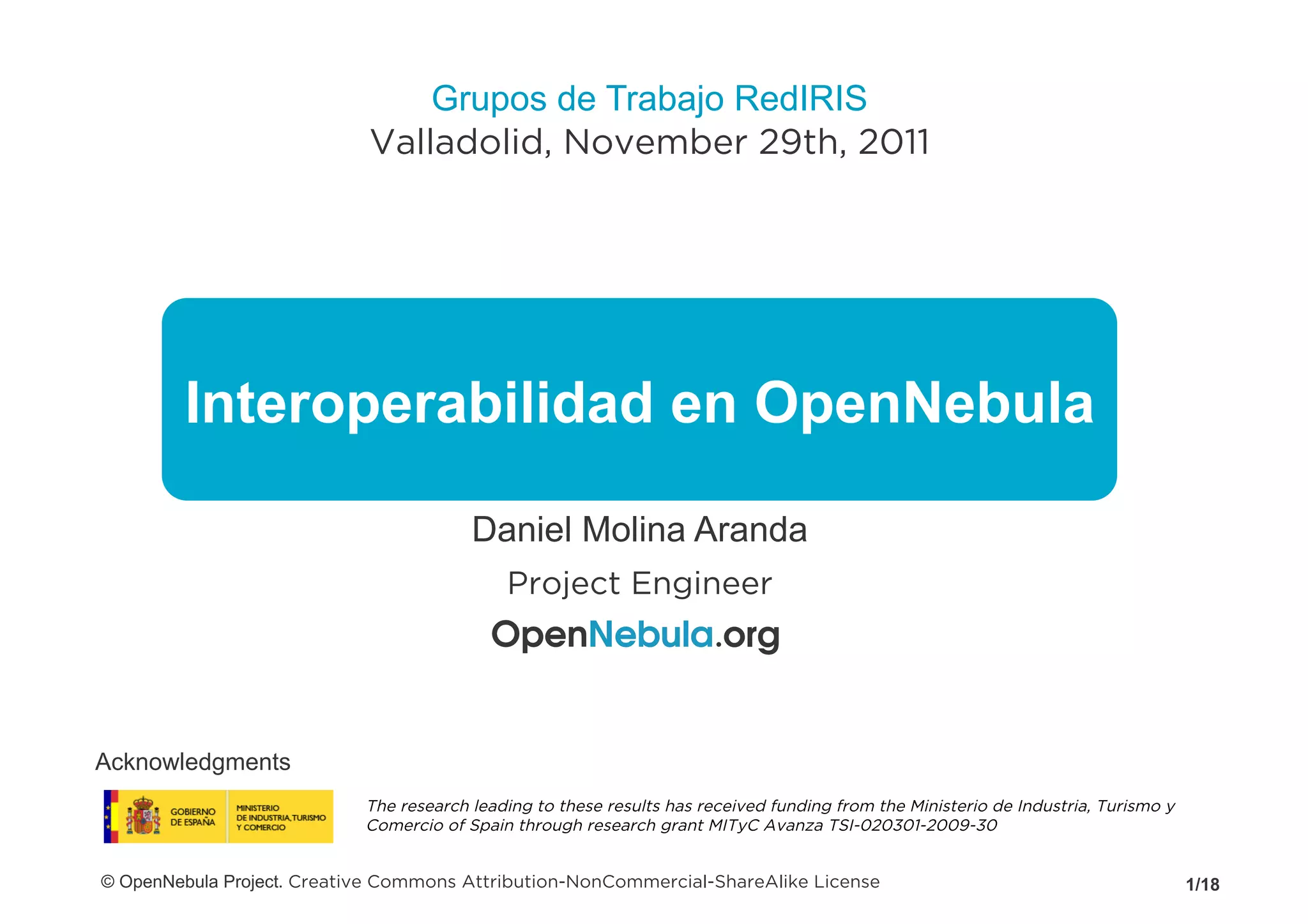 The document discusses OpenNebula, an open-source tool for managing virtual infrastructure in data centers. It addresses the challenges of portability and interoperability across cloud platforms. OpenNebula's approach leverages standards like OVF and CDMI and implements adaptors for interoperation. Examples are given of community projects collaborating with OpenNebula to develop standards-based solutions for cloud federation using OCCI.