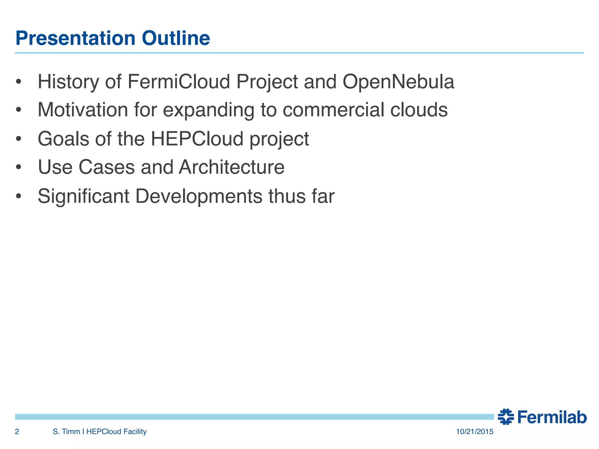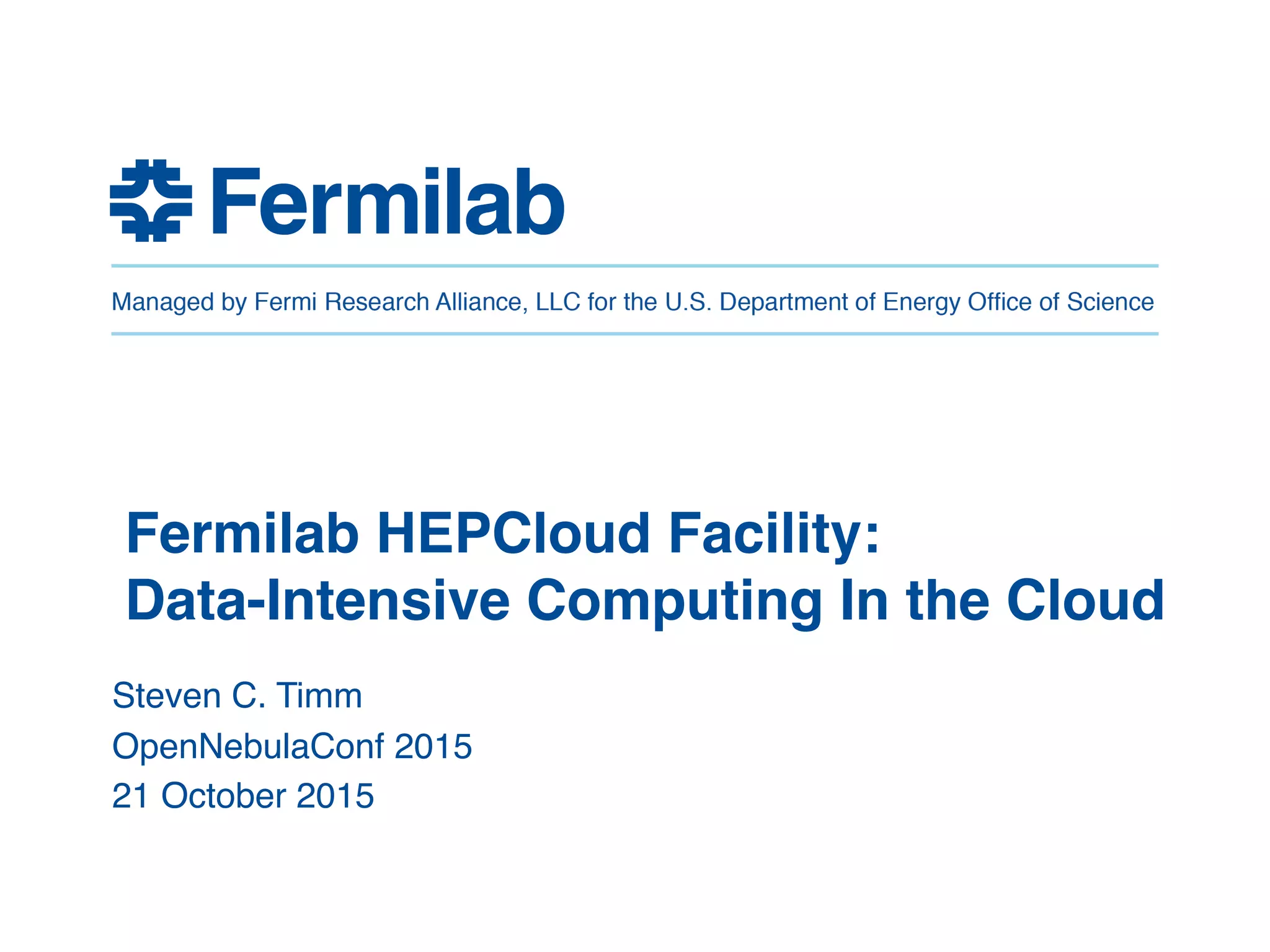 The document discusses the Fermilab HEPCloud project, which aims to expand data-intensive computing capabilities by integrating commercial and community cloud resources with existing infrastructure. It outlines the history, motivation, significant developments, use cases, and future considerations related to the project, emphasizing the need to address peaks in demand without overprovisioning. The document highlights the potential for high energy physics computing needs to harness multiple computing platforms to meet increasing demands efficiently.