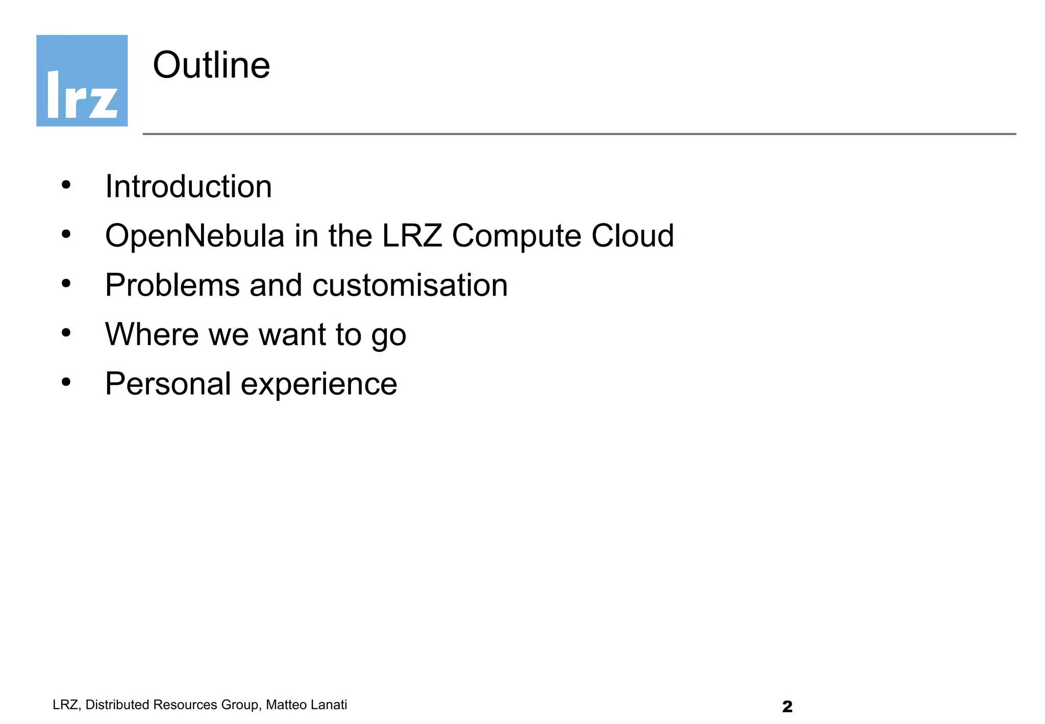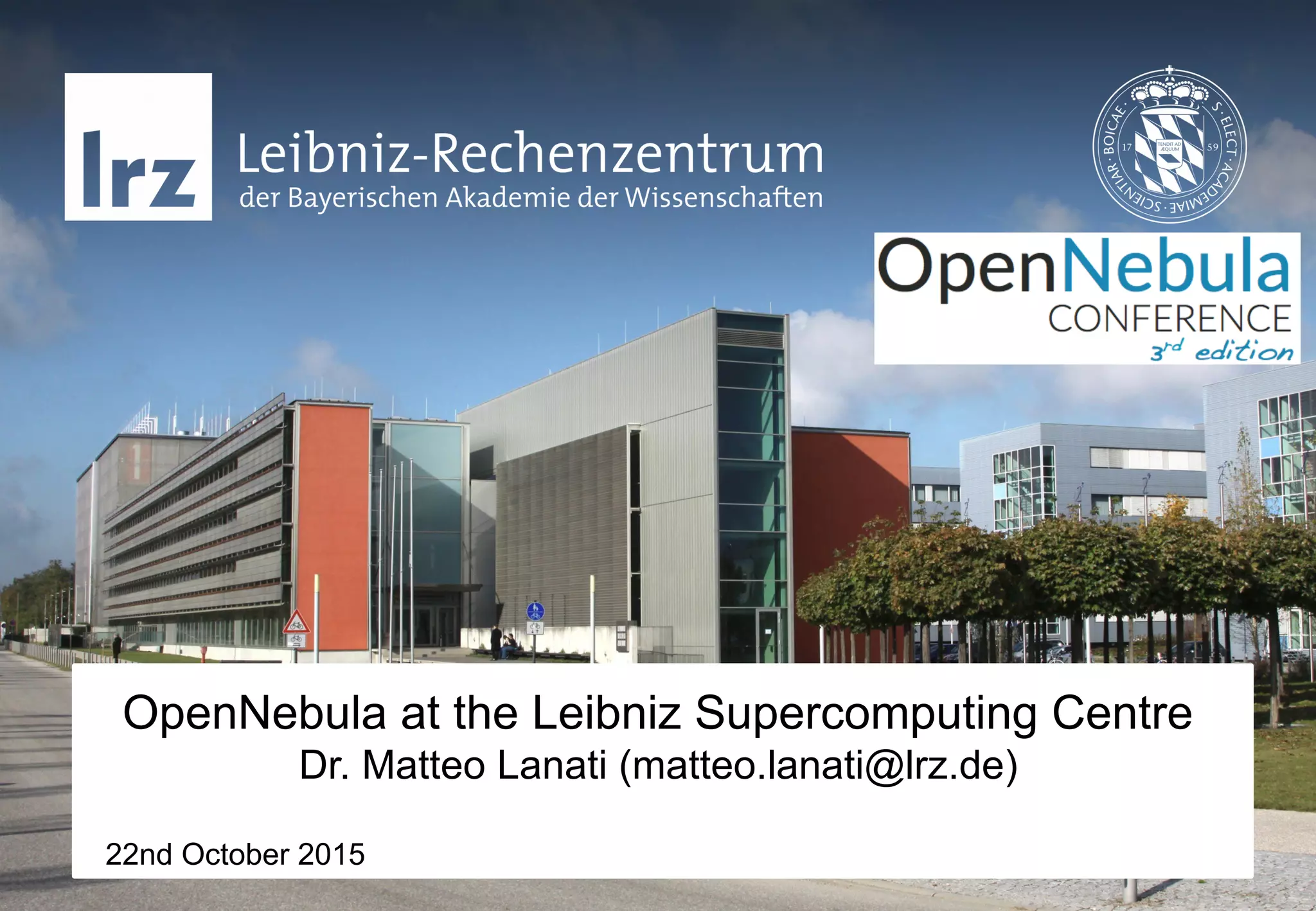 The document presents an overview of the implementation and features of OpenNebula at the Leibniz Supercomputing Centre, covering its use in high-performance computing environments and addressing various challenges such as resource management and network isolation. Key topics include the integration of budgeting for CPU-resource usage, modifications for public IP pool handling, and techniques for grouping and isolating virtual machines. The author, Dr. Matteo Lanati, shares personal experiences and future goals related to the project.