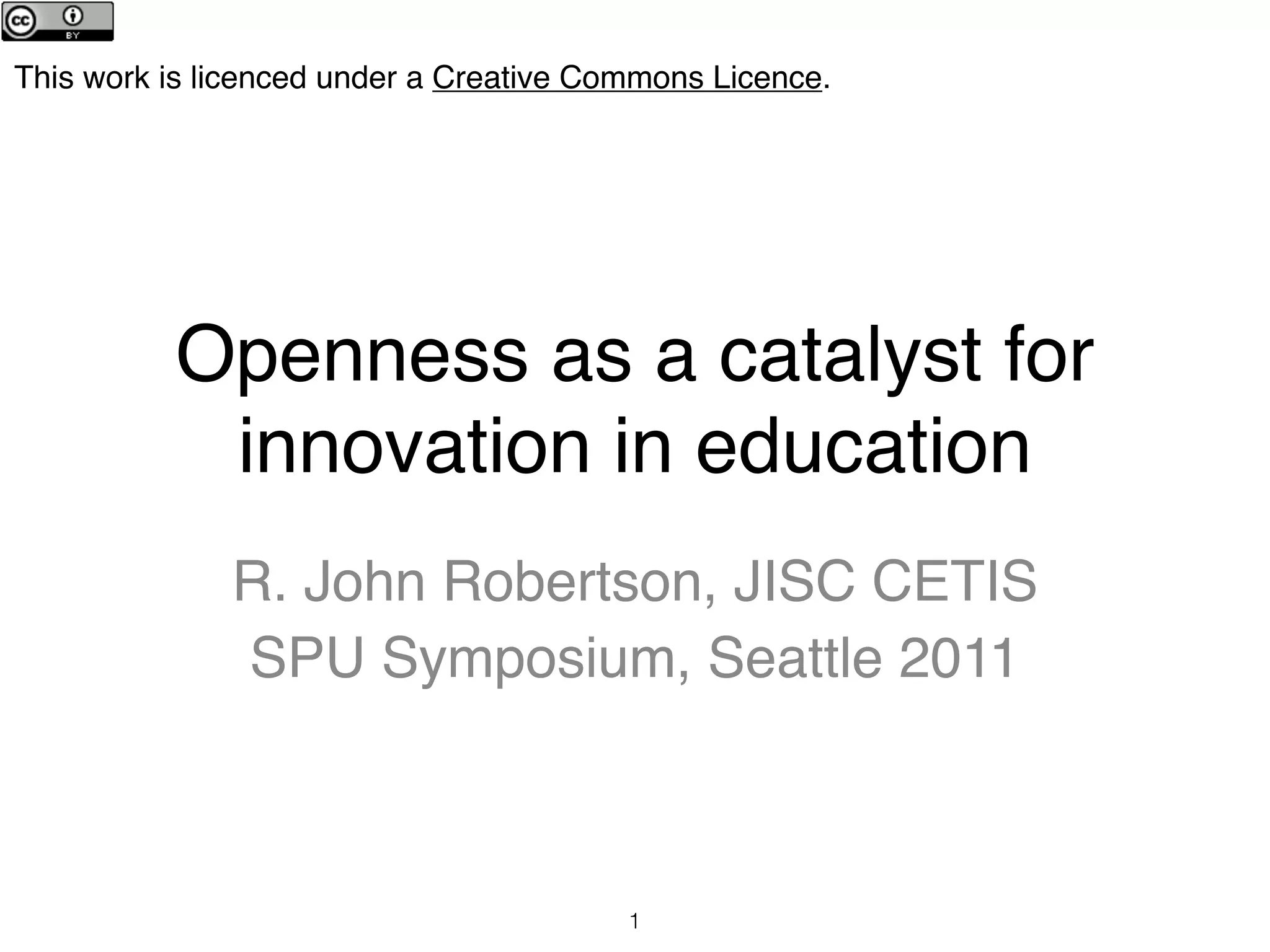 The document discusses the role of openness in driving innovation within education, particularly through initiatives like the UK's Open Educational Resources (OER) program supported by JISC. It highlights the importance of making high-quality educational resources freely available and the impact on student learning experiences and recruitment. Additionally, it explores various approaches to sharing content openly and the implications of educational content ownership.