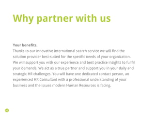 Openployer is an HR consulting firm committed to innovative HR solutions. They connect solution providers with organizations to help them achieve outstanding performance through partnerships. Their services cover the entire career lifecycle, including talent acquisition, leadership development, and employee retention. As a partner, organizations benefit from Openployer's experience and insights to find the best HR solutions tailored to their needs. Openployer works with an international network of experts to provide its services.