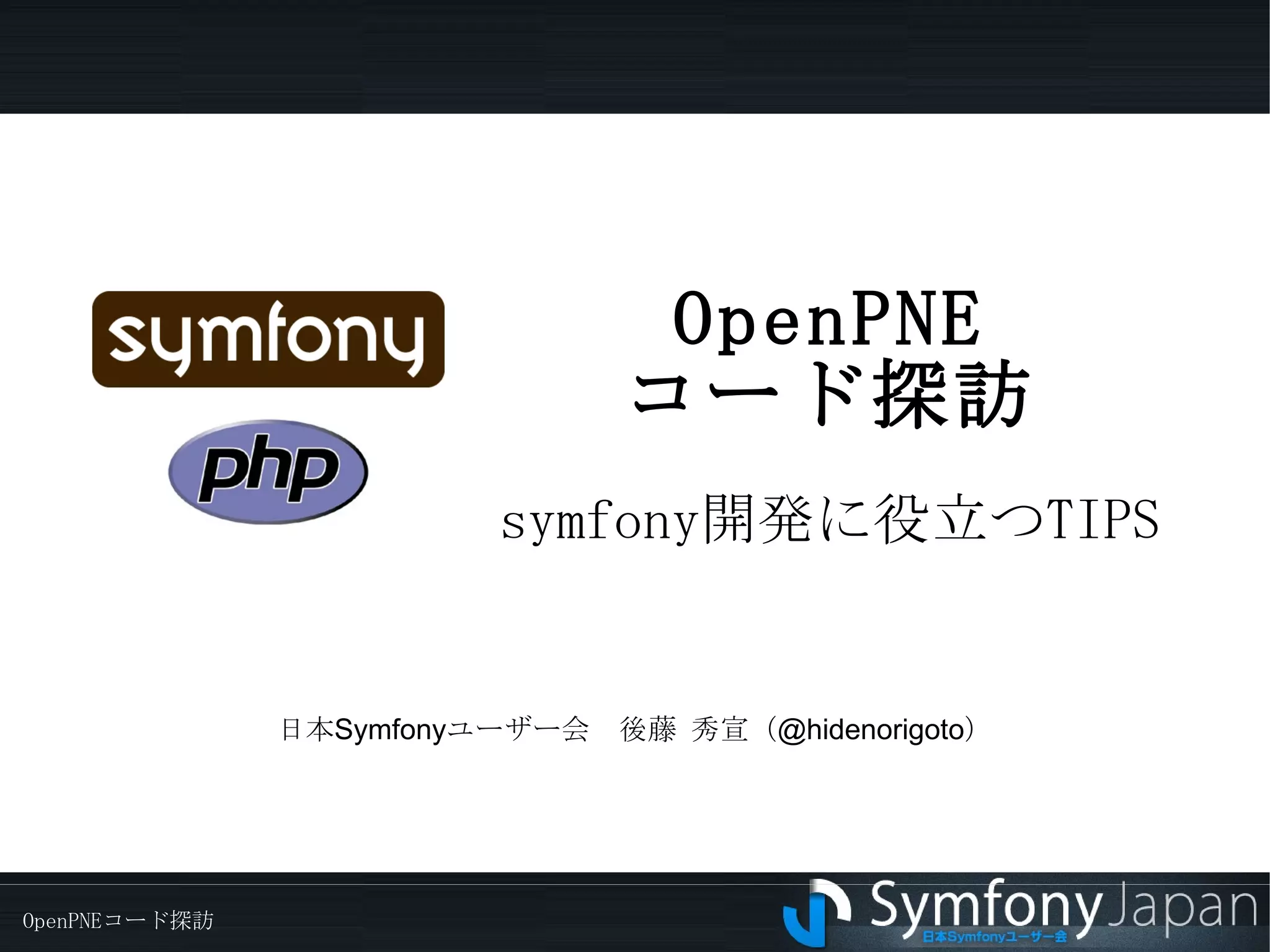 概要 OpenPNEのコードを読んで、symfony開発に役立つTIPSを紹介します
