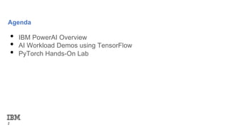 The document provides an overview and agenda for an introduction to running AI workloads on PowerAI. It discusses PowerAI and how it combines popular deep learning frameworks, development tools, and accelerated IBM Power servers. It then demonstrates AI workloads using TensorFlow and PyTorch, including running an MNIST workload to classify handwritten digits using basic linear regression and convolutional neural networks in TensorFlow, and an introduction to PyTorch concepts like tensors, modules, and softmax cross entropy loss.