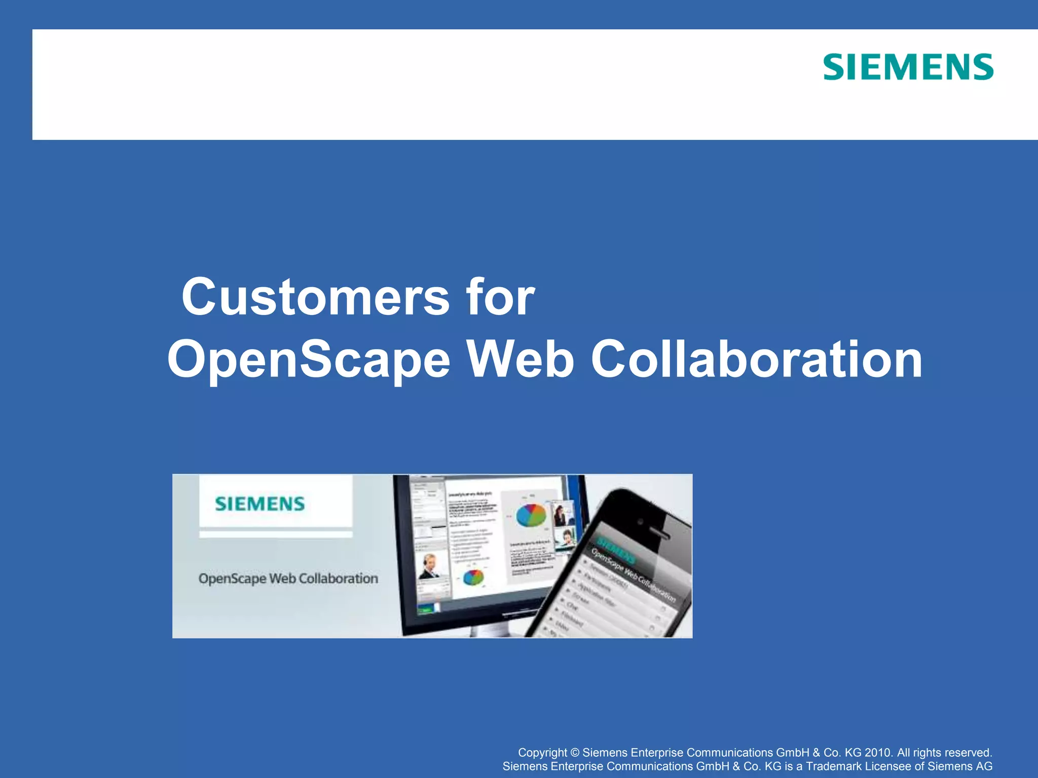 The document outlines how OpenScape Web Collaboration is beneficial for businesses with geographically dispersed teams and aims to reduce travel costs while enhancing collaboration and productivity. It highlights various industries that can benefit, including software, financial services, public sector, and education, focusing on improving communication, training, and customer relationships. Additionally, it emphasizes real-time collaboration, remote support capabilities, and overall efficiency in operations.