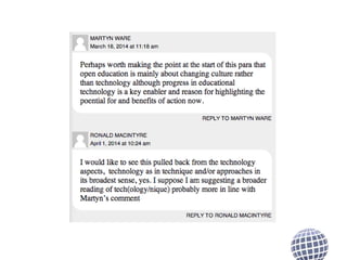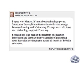 The document outlines the Open Scotland initiative, which promotes open education and the sharing of open educational resources across Scottish education. It details various projects, frameworks, and collaborations such as the Scottish Open Education Declaration and the UK Open Educational Resources (OER) programme, emphasizing the importance of openness in enhancing educational practices. Additionally, it addresses strategic priorities and challenges in education, encouraging community engagement and the adoption of open practices to benefit learners and educators.