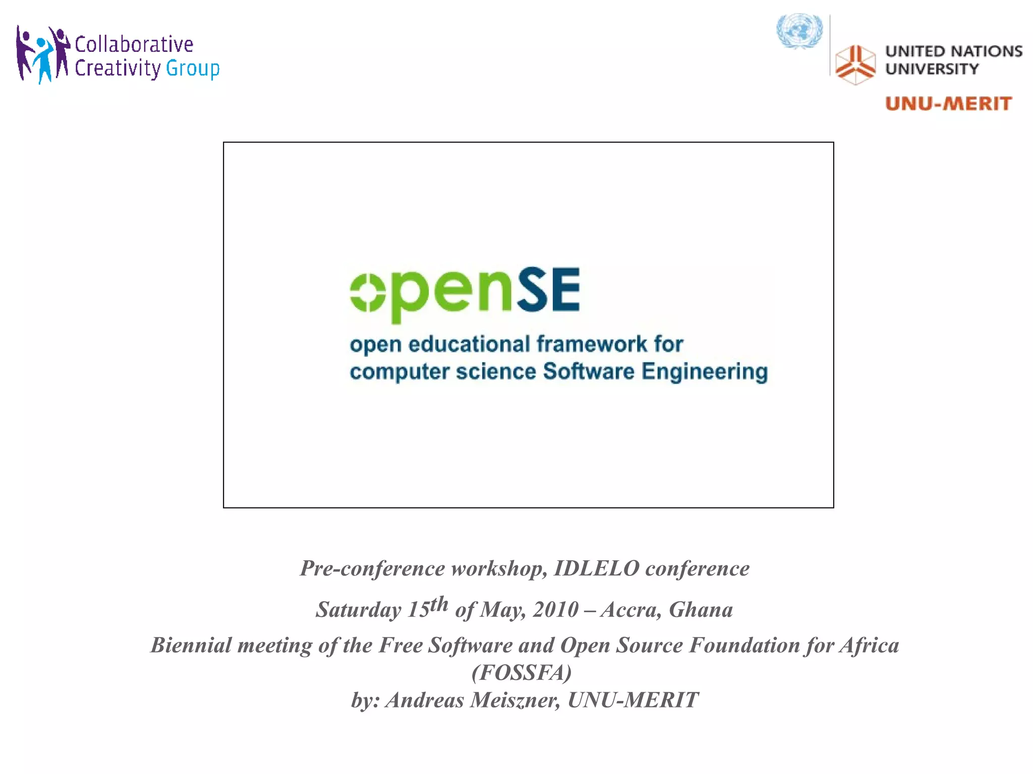 The document describes an open educational framework called openSE that aims to combine formal and informal learning. It provides benefits for higher education institutions, students, free learners, open source projects, and enterprises. The framework brings together academia, students, and open source practitioners to foster participatory learning through hands-on projects. Learners can benefit from others' work and contributions in a continuous, community-driven environment outside of traditional educational settings. The openSE framework utilizes various online tools and spaces to facilitate collaboration and peer-to-peer learning through self-organized projects.