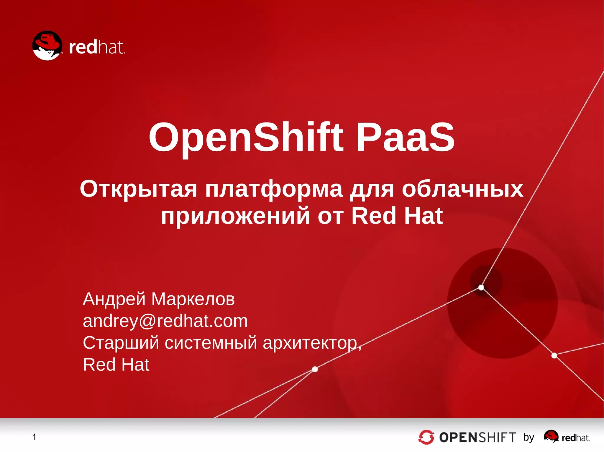 Документ представляет собой обзор платформы OpenShift от Red Hat, которая предлагает решения PaaS для разработки и развертывания облачных приложений. Он подчеркивает инновации в OpenShift, такие как поддержка контейнеров Docker и оркестрации Kubernetes, а также преимущества, такие как автомасштабирование и безопасность. Документ также описывает интеграции с различными интерфейсами и инструментами для разработчиков.