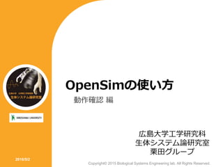 Biological Systems Engineering lab. OpenSim3.3が正常に動作するかどうか確認する. Copyright© 2015 Biological Systems Engineering lab. All Rights Reserved. 3 OpenSimの使用準備 ひとまず筋骨格モデルが開ければOK. ① OpenSimを起動 ② 画面左上「File」 →「Open Model…」