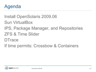 The document provides an agenda and overview for a workshop on key OpenSolaris 2009.06 technologies including installing OpenSolaris, the IPS package manager, ZFS and Time Slider, and DTrace. It discusses options for installing OpenSolaris natively, in a partition, or in VirtualBox. It also provides demonstrations of the IPS package manager, managing repositories, ZFS features like snapshots and Time Slider, and using DTrace to monitor system calls.