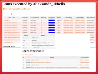 Документ описывает реализацию тестового фреймворка на основе open-source инструментов, таких как Watir, и включает архитектуру, требования и практические рекомендации. Основное внимание уделяется гибкости и расширяемости фреймворка, а также важности качественного проектирования и поддержки автоматизации тестирования. В документе также рассматриваются риски и подходы к созданию эффективных инженерных решений для тестирования программного обеспечения.