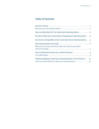 This document discusses Sun's Solaris and OpenSolaris operating systems. It highlights their advantages over proprietary systems, including lower costs, flexibility, and continuous innovation from open source communities. It describes key features of Solaris/OpenSolaris like performance optimization, virtualization, availability, data management, and a case study of how they enabled a more cost-effective security solution for retailers. Overall, it promotes Solaris/OpenSolaris as strategic platforms that provide unmatched features, flexibility and reliability for enterprises.