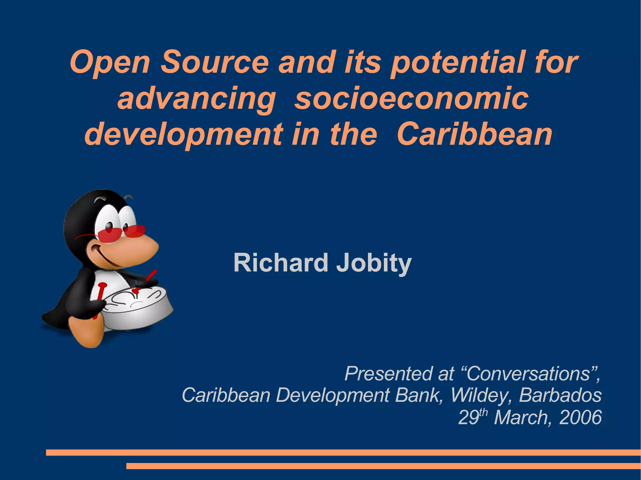 The document discusses the potential of open source software (OSS) to advance socioeconomic development in the Caribbean, highlighting its definition, advantages, and barriers to adoption. Key issues include cultural factors, concerns about support and credibility, and the benefits of OSS over proprietary software, particularly in terms of cost and local capacity building. It also outlines potential next steps for development institutions, such as raising awareness and supporting technical transitions to OSS.