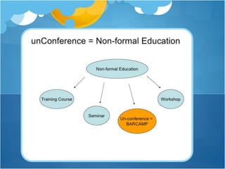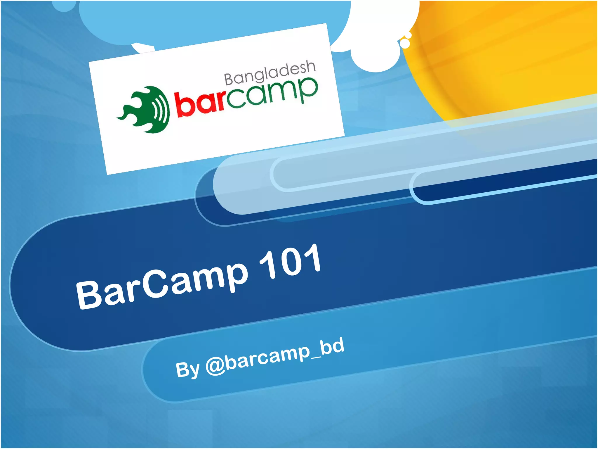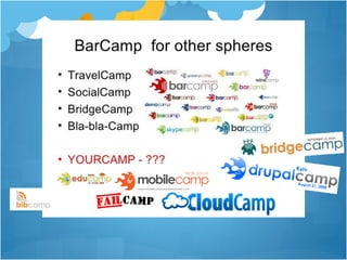 BarCamp is an open, participant-driven event where people gather to share, learn, discuss, give demos, and interact on various topics. There are no spectators, only participants, and no pre-scheduled presentations - participants choose which sessions to attend. BarCamp aims to foster community by providing a free, open environment for user-generated content without set speakers or agendas. The first BarCamp had 200 attendees and helped spawn similar "unconference" events worldwide focused on bringing people together to learn from each other.