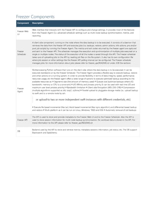 پذیر انعطاف گیری پشتیبان سیاست قالب در ها داده GNU Tar شوند می بایگانی فایل بر مبتنی افزایشی برای ( بر مبتنی گیری پشتیبان از پشتیبانی rsync ) ( چندگانه سازی فشرده الگوریتم از پشتیبانی zlib، bzip2، xz ) کنید حذف خودکار طور به را قدیمی پشتیبان نسخه ،شده ارائه پارامترهای به توجه با ،محلی فایل سیستم ،(سوئیفت چندگانه سازی ذخیره های رسانه از پشتیبانی ssh ) کنید فالش دیسک روی را هسته شده بافر حافظه * ،ویندوز ،(لینوکس فرم پلت چند BSD، OSX ) )گره یک در پشتیبان نسخه چندین (یعنی کنید مدیریت را کار چندین گره چندین در بازیابی و گیری پشتیبان سازی همگام با شده ادغام وب کاربری رابط OpenStack Horizon کند اجرا کار اجرای از بعد یا قبل را دستورات / ها اسکریپت تواند می کم منابع به نیاز ،خروجی/ورودی مصرف که است شده طراحی ای گونه به فریزر CPU از داده جریان یک تولید با این .دهد کاهش حداقل به را حافظه و tar و )بایگانی (برای gzip - گزینه (با تنظیم قابل قطعه اندازه در را جریان فریزر .آید می دست به )سازی فشرده (برای max-seg-size تقسیم ) بخش فرض شپی اندازه .کند می 64 ،کلید ارائه صورت در ،کرد ذخیره حافظه در راحت خیال با را آن توان یم بنابراین ،است مگابایت .کرد آپلود سوئیفت در بخش یک عنوان هب و کرد رمزگذاری فایل سپس و شوند یم آپلود ها شبخ همه ابتدا .شوند می آپلود سوئیفت مانیفست از استفاده با متوالی صورت به بخش چندین Manifest .کند می تضمین را ها داده یکپارچگی این .داشت دسترسی ًامستقیم توان ینم داده های شبخ به بنابراین ،شود یم آپلود نیز از استفاده ،حافظه در ها بخش داشتن نگه کوچک با I/O نهایی فشرده آرشیو محلی ذخیره به نیازی که آنجایی از همچنین .یابد می کاهش ( tar-gziped عکس اندازه نیاز مورد اضافی فضای تنها .نیست اختصاصی یا اضافی سازی ذخیره به نیازی پشتیبان اجرای برای ،نیست )