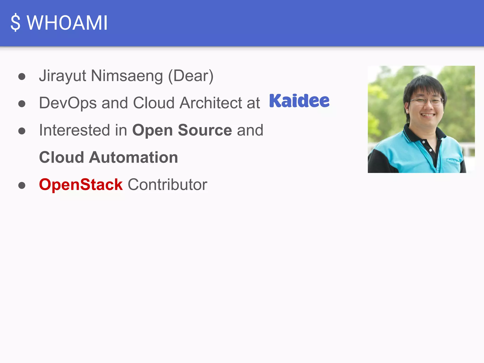 The document discusses the use case of OpenStack and Ansible for managing a private cloud in a large online marketplace in Thailand, highlighting its scale and user engagement. It contrasts public and private clouds, emphasizing the benefits of OpenStack such as cost-saving, scalability, and an open-source approach free from vendor lock-in. The presentation also underscores the adoption of Ansible for its flexibility, ease of configuration, and infrastructure as code capabilities.