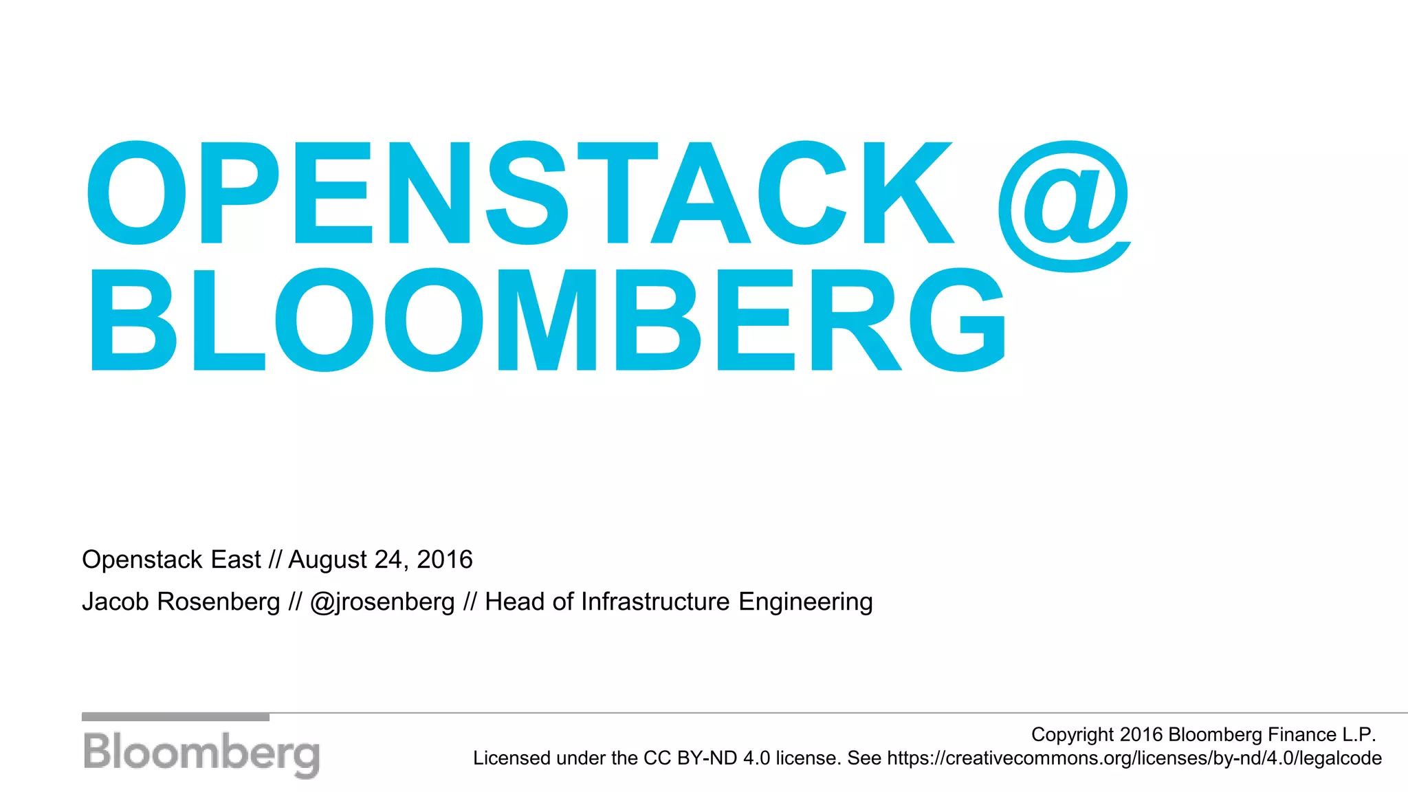 Jacob Rosenberg gave a presentation on OpenStack at Bloomberg. He discussed why Bloomberg uses a private cloud (to have proximity to data and control customization). Bloomberg chose OpenStack because it had the most established community but wanted to make their own technology choices, resulting in them building their own OpenStack-based private cloud called BCPC. The cloud has seen significant adoption within Bloomberg with growth of instances and CPUs, though some challenges were faced integrating existing systems. Future plans include further promoting adoption, container hosting, and new hardware capabilities.