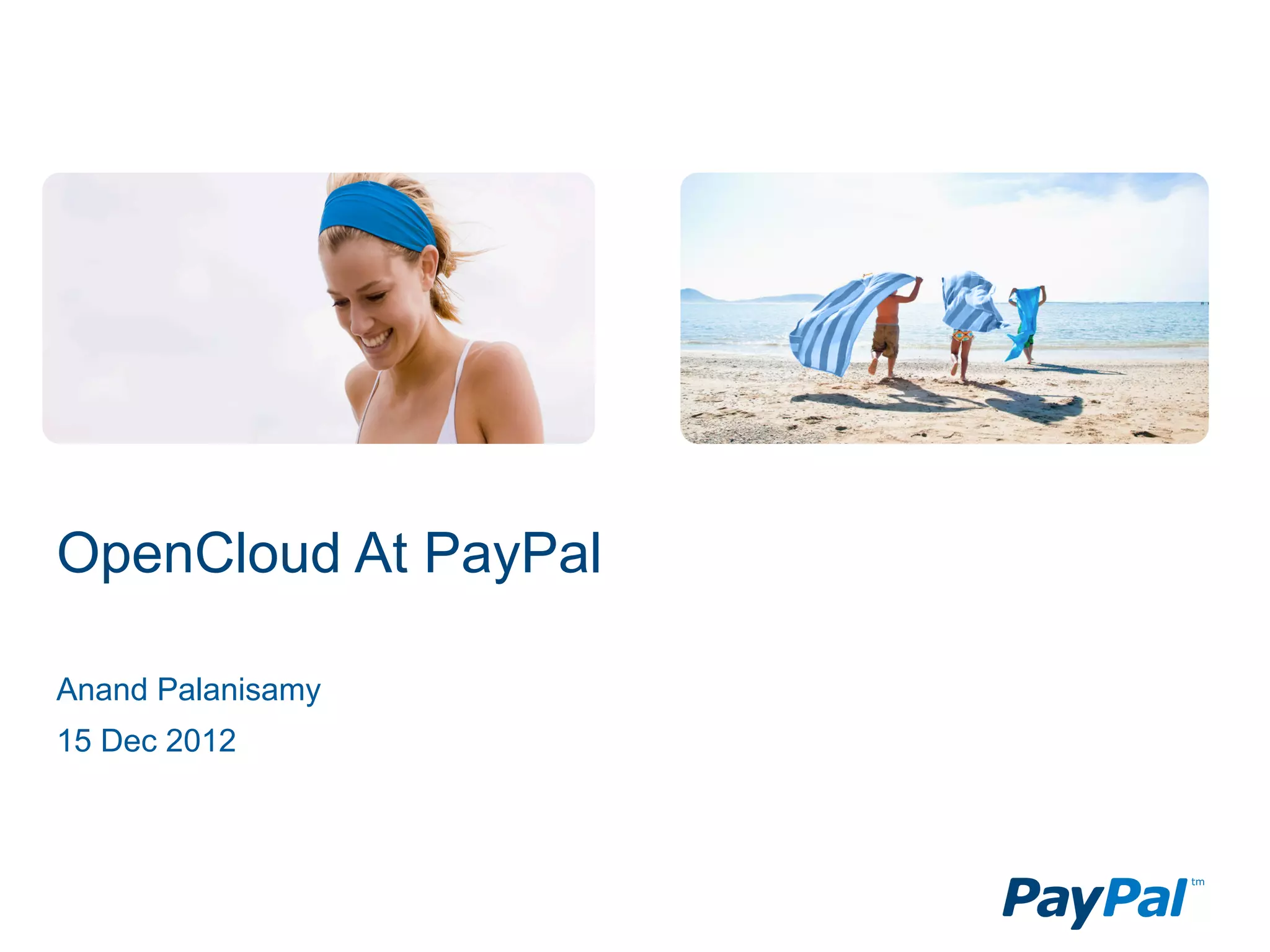 This document outlines PayPal's OpenCloud platform built using OpenStack. The platform aims to provide agility, availability and innovation through a unified PaaS and IaaS stack. It uses OpenStack for compute, storage and networking with additional services for load balancing, DNS management and monitoring. The current deployment includes one OpenStack installation per data center, supporting 1300 VMs across 96 compute nodes. Lessons learned so far include fitting OpenStack into existing infrastructure and customizing availability zones. Future plans include improving networking, bare metal provisioning, and extending the platform to development, QA and other environments.