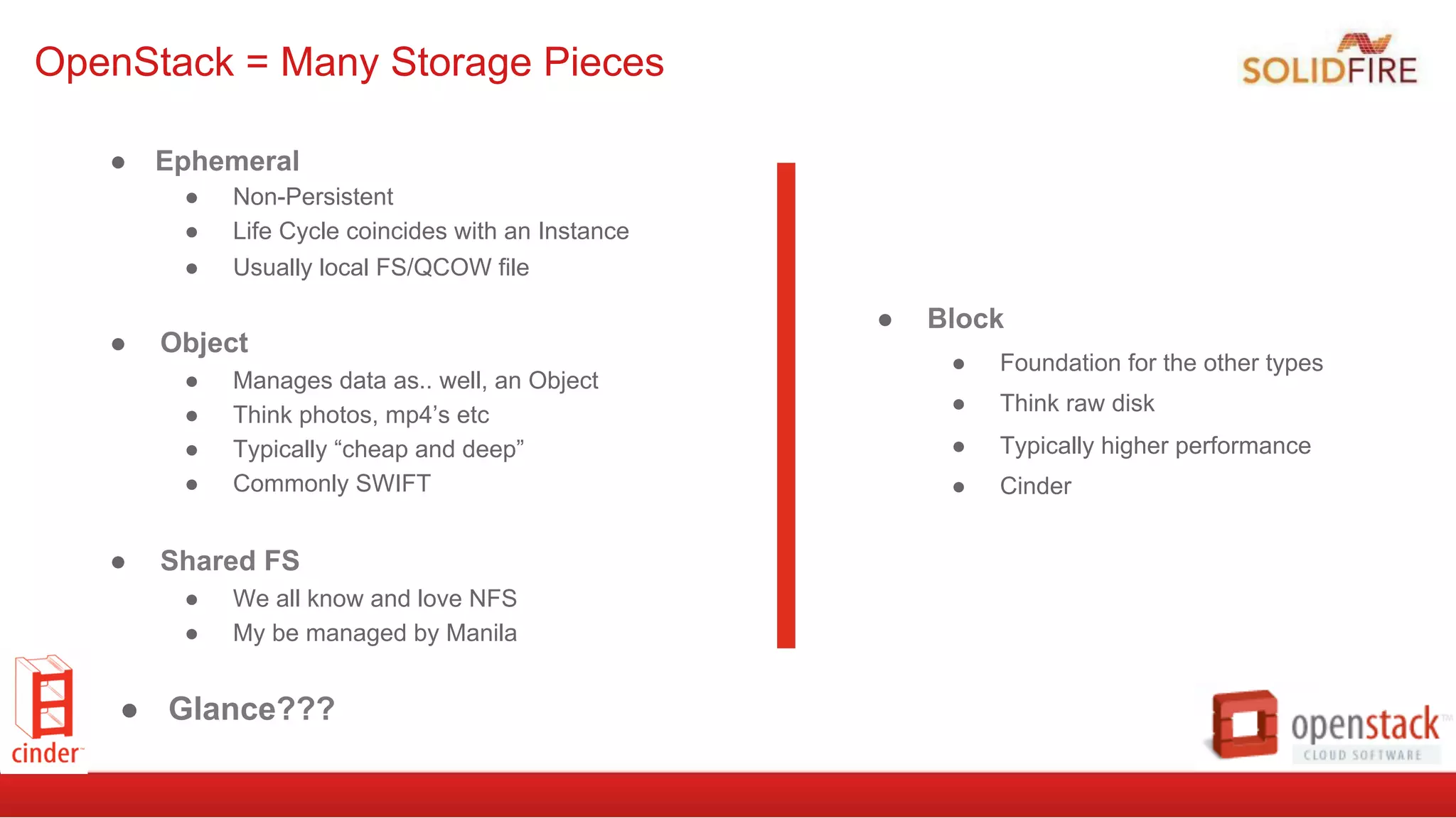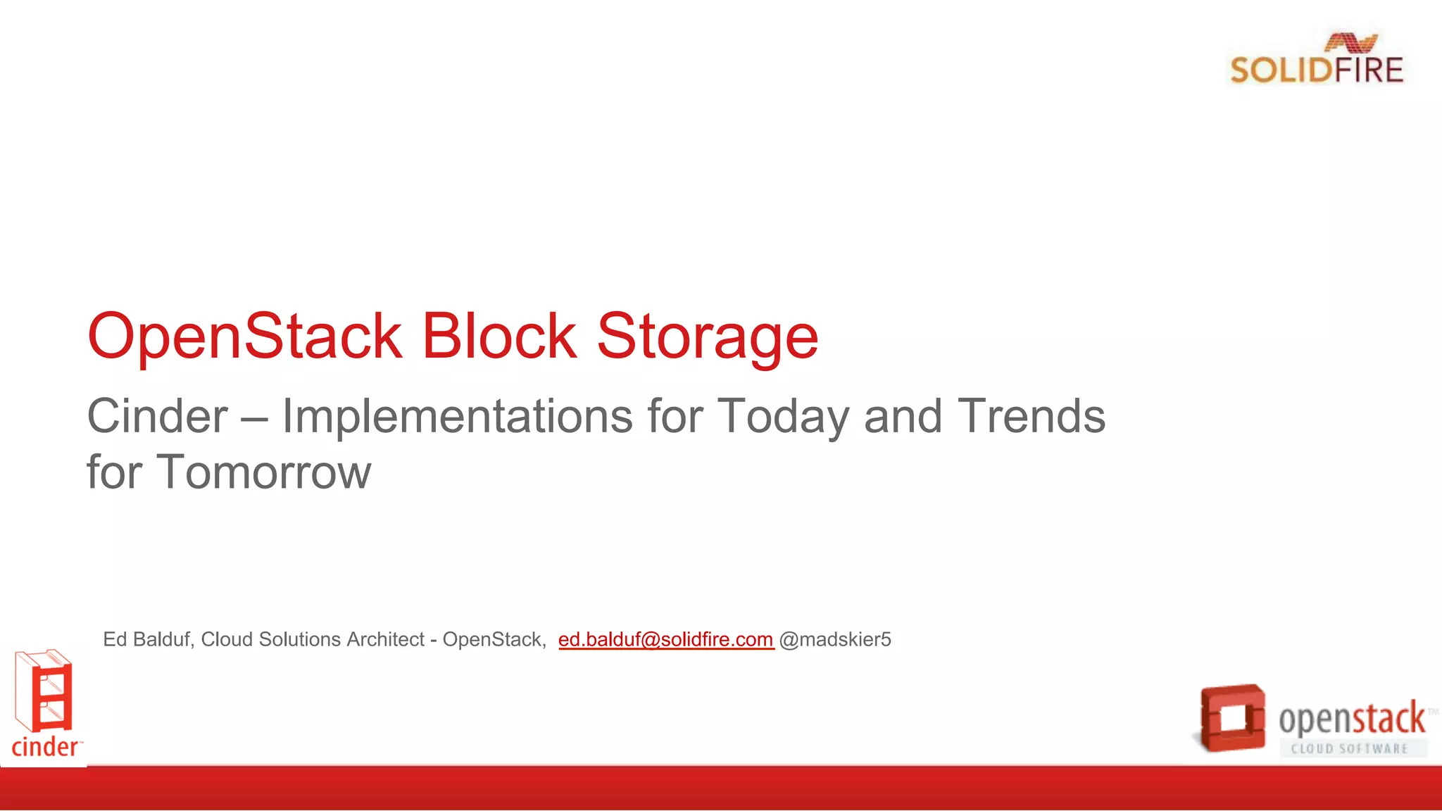 This document discusses OpenStack Block Storage (Cinder) implementations, trends, and the future direction of Cinder. It provides an overview of Cinder's mission to provide on-demand, self-service block storage and its plugin architecture that supports various backend storage devices. It also discusses some common storage types in OpenStack and looks at specific Cinder features, configurations, and the user experience. The document concludes by exploring how Cinder may evolve to better support enterprise applications and looks at upcoming changes in the Liberty release.