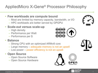 The document introduces AppliedMicro's X-Gene® processor technology. The X-Gene 1 and X-Gene 2 are server-on-a-chip solutions that integrate ARMv8 CPU cores, memory controllers, networking, storage and I/O interfaces while achieving high performance and low power. Benchmark results show the X-Gene processors providing competitive performance to Intel Xeon chips while using less power. The high-density, low-power X-Gene chips allow building scale-out servers that deliver significantly higher performance and lower costs than traditional scale-up servers for various workloads like web applications and databases.