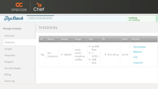 The document discusses the use of Chef for deploying and managing OpenStack, highlighting the complexities of infrastructure and how Chef simplifies processes through infrastructure as code. It outlines how Chef allows for programmatic provisioning, configuration management, and integration of various resources, including load balancers and databases. The document also touches on community collaboration, existing resources, and the roadmap for future enhancements of Chef's OpenStack capabilities.