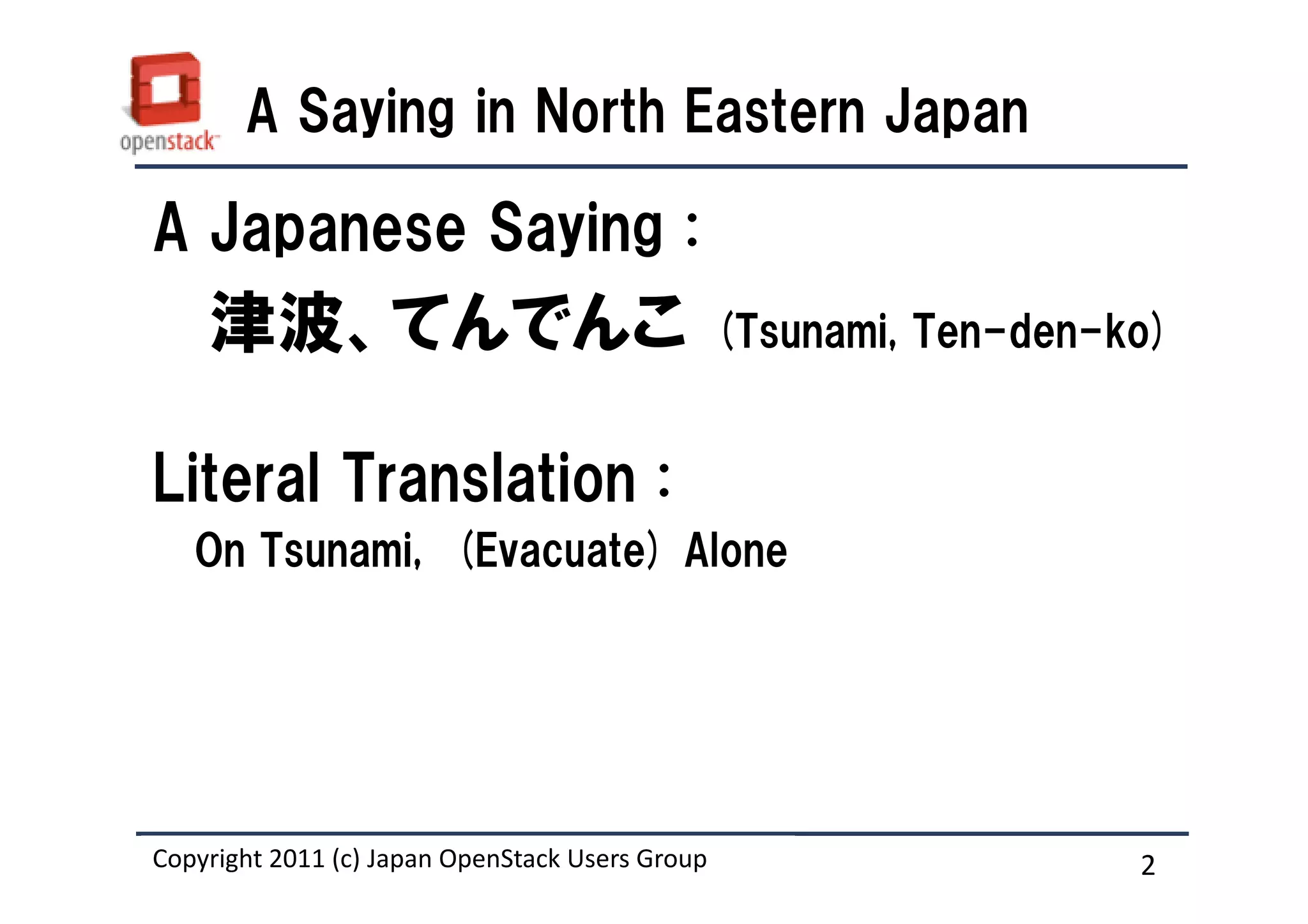 The document discusses a Japanese saying "Tsunami, Ten-den-ko" which means that during a tsunami, one should evacuate alone without waiting for or assisting others. It notes this principle is meant for emergency situations and implies families should trust each other to independently follow this rule to maximize survivors. The author suggests communities like the OpenStack community can apply similar principles - working independently towards a shared goal while maintaining an open development process.