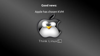 The document discusses the adoption of KVM by Apple and highlights its implications for cloud computing, emphasizing the growing importance of open-source software in this domain. It outlines various Canadian projects utilizing OpenStack for diverse applications, showcasing its versatility in infrastructure management. Additionally, it addresses the necessity of adapting cloud technologies to real-world requirements while promoting vendor independence.