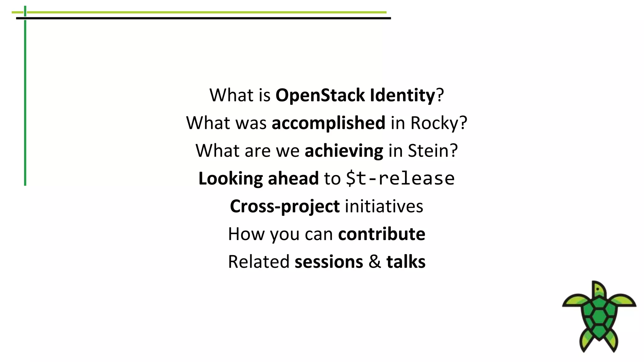 The document provides an update on the OpenStack identity project, detailing accomplishments in the Rocky release, ongoing goals in the Stein release, and future initiatives. Key achievements include improvements in role management, unified limits, and framework enhancements, while future goals involve further development of application credentials and multi-site capabilities. The document also encourages community participation through office hours and related sessions.