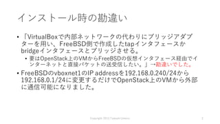 インストール時の勘違い • 「VirtualBoxで内部ネットワークの代わりにブリッジアダプ ターを⽤い、FreeBSD側で作成したtapインタフェースか bridgeインタフェースとブリッジさせる。 • 要はOpenStack上のVMからFreeBSDの仮想インタフェース経由でイ ンターネットと直接パケットの送受信したい。」→勘違いでした。 •