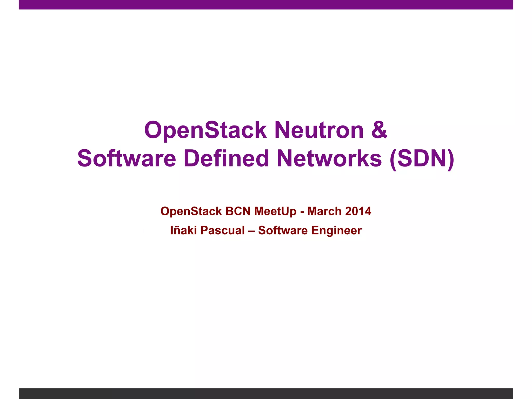 The document discusses OpenStack Neutron and Software Defined Networks (SDN). It begins with an agenda for a demonstration of Neutron including creating networks, spawning VMs, testing connectivity, and creating load balancers. It then provides an overview of Neutron components and architecture, including the modular layer 2 plugin. It demonstrates Neutron APIs and network namespaces. It introduces SDN concepts like the control plane and network virtualization. Finally, it discusses how Neutron enforces SDN through plugins like PLUMgrid that implement the functionality on software edges in compute nodes.