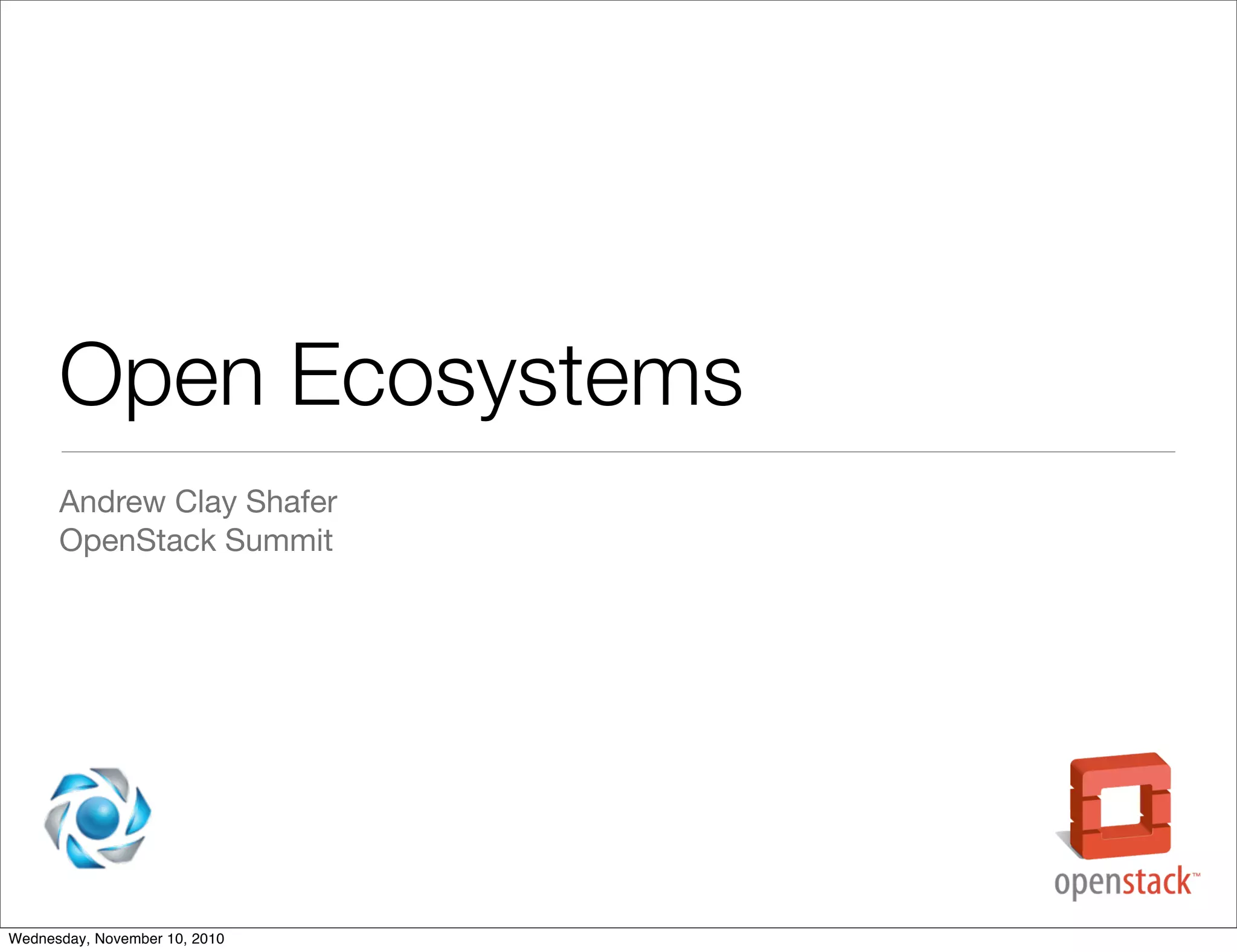 Andrew Clay Shafer gave a presentation at the OpenStack Summit on November 10, 2010 about open ecosystems and cloud computing. He discussed how most code for Linux and other open source projects comes from hundreds of individual contributors rather than just a few large companies. Shafer envisions a community of service providers working together using shared open technologies, with an open "kernel for the cloud" that enables services to be built and deployed easily. He discussed some principles for reliability in cloud systems and challenges around standardization and interoperability.