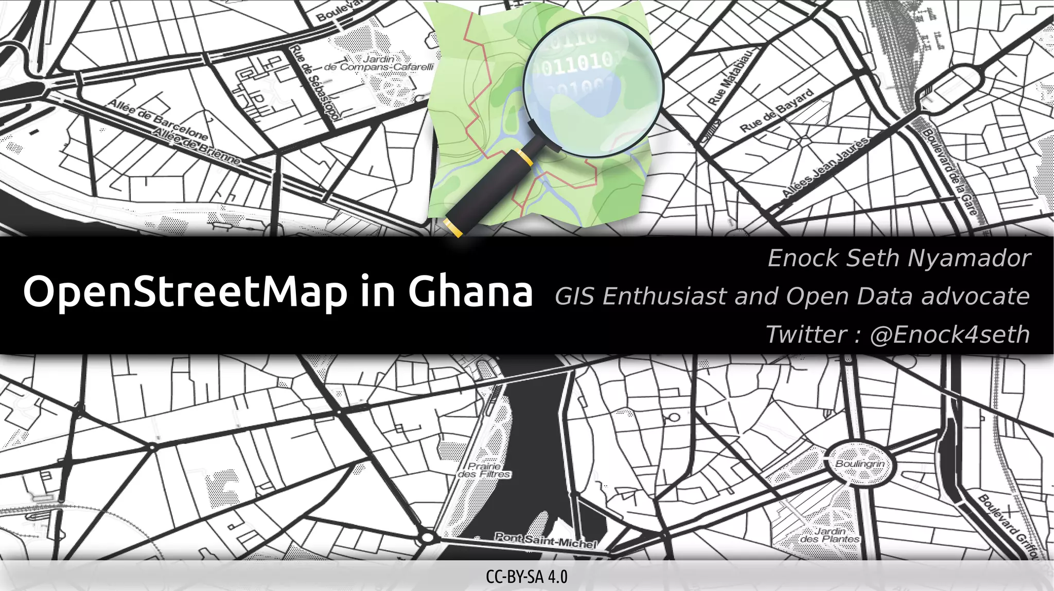 OpenStreetMap is a collaborative project to create a free editable map of the world. It uses crowdsourced data that anyone can collect or edit. Contributors map locations and attributes using nodes, ways, and relations. The data is licensed under the open database license and can be used for any purpose including humanitarian and commercial applications. The presentation encourages participants to get involved by editing locations in their area or using OpenStreetMap data in their work.