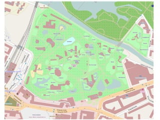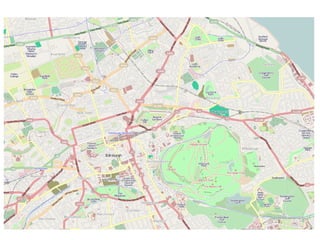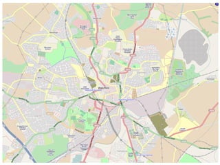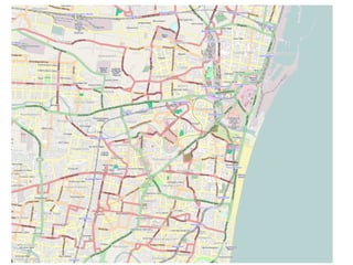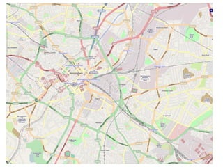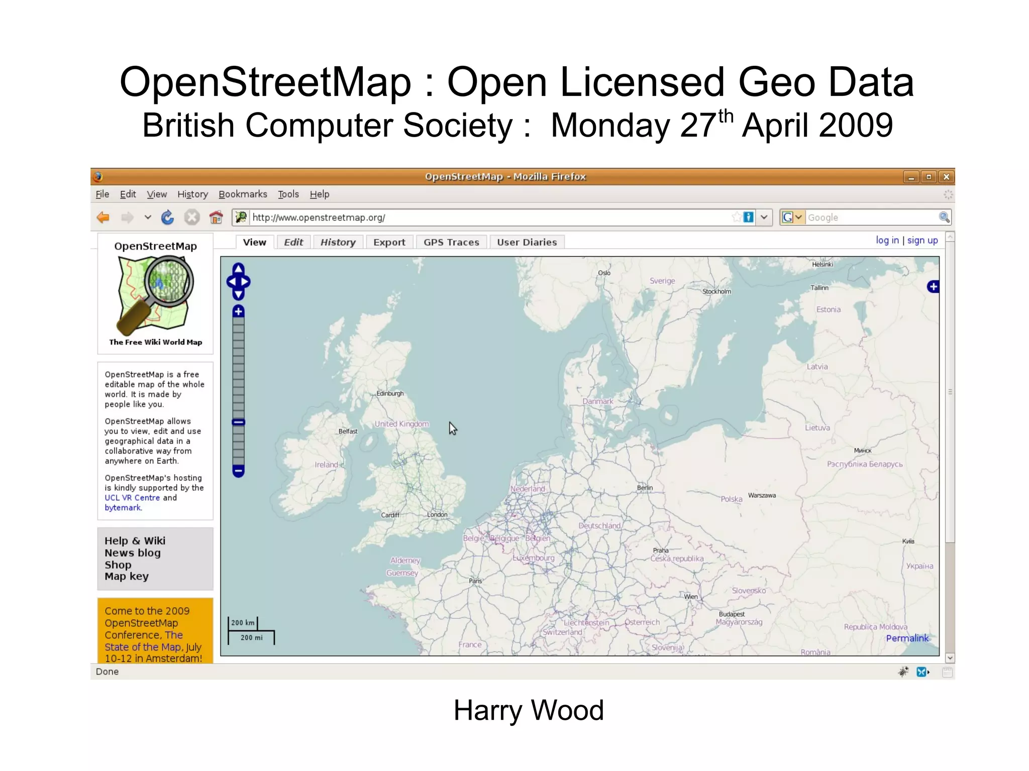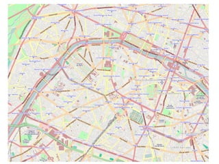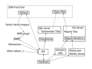 This document summarizes a presentation about OpenStreetMap. It discusses OSM's purpose of creating an openly licensed map, its data structures of nodes, ways and tags, and tools for editing and viewing map data. OSM is built by a large volunteer community contributing GPS traces and other mapping data. Its data is hosted on servers and rendered into map tiles using tools like Mapnik. The presentation highlights OSM's open licensing and wiki-based approach to tagging locations, similar to Wikipedia.