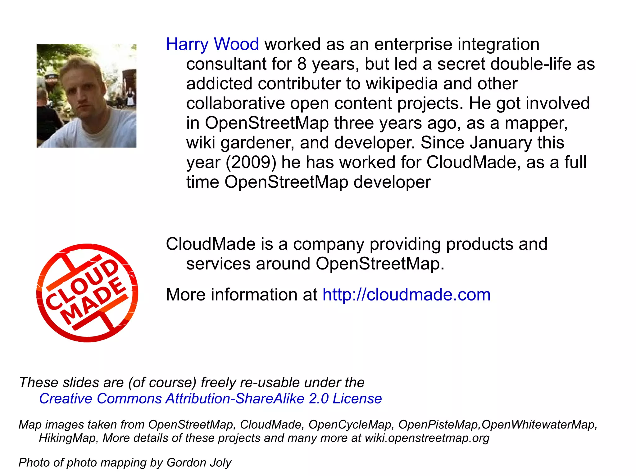 The document discusses OpenStreetMap (OSM) as a collaborative mapping platform where users can read and write to its XML API, creating detailed maps by contributing local knowledge and editing existing data. With around 170,000 registered users, OSM promotes an open-licensed model that allows for free use and redistribution of its data, distinguishing itself from traditional commercial maps. The author's experience within the OSM community highlights the platform's success and the ongoing efforts to maintain quality contributions and community engagement.