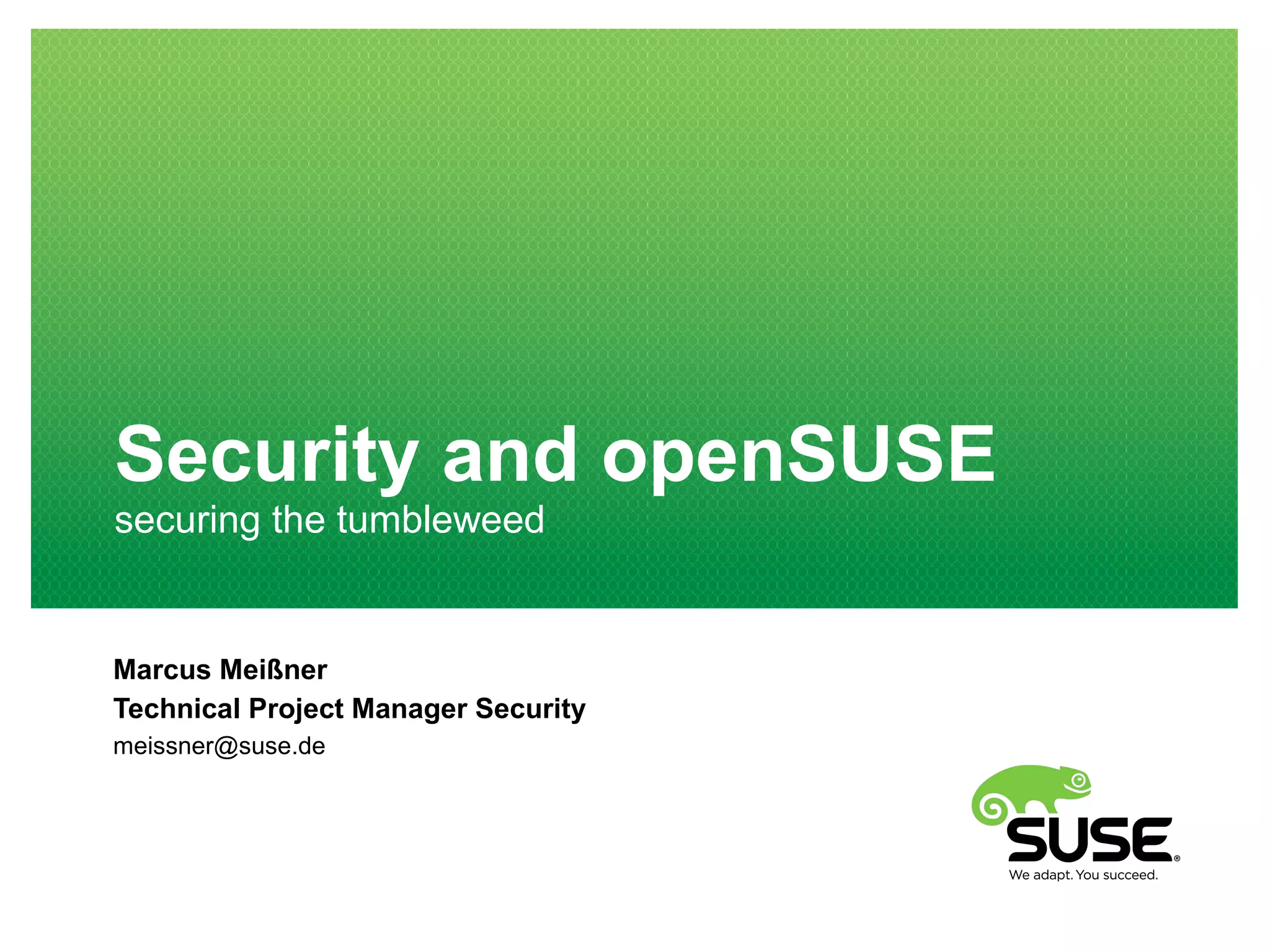 The document outlines the security measures for openSUSE, managed by a dedicated security team, detailing processes for addressing vulnerabilities before and after releases. It discusses various automated checks, reviews for new technologies, and ongoing efforts to enhance system security through compiler checks and auditing. Additionally, it emphasizes community involvement in maintaining security through updates and reporting security-related issues.