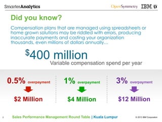 The document discusses challenges faced by organizations in managing sales performance and compensation, emphasizing that traditional methods like spreadsheets can lead to costly errors. It presents IBM's Sales Performance Management (SPM) as a solution that automates processes, reduces errors, and improves efficiency. The roundtable includes insights from various experts on optimizing compensation plans to drive sales behavior and meet corporate goals.