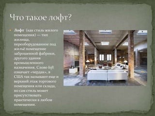 Лофт - это стиль преобразованных промышленных помещений для жилья и культурных инициатив, зародившийся в США в 1940-х годах и ставший популярным среди художников. Современные лофты используются как многофункциональные пространства для бизнеса, искусства и общественной жизни, как, например, арт-кластер Винзавод в Москве. В России увеличивается интерес к лофт-дизайну, хотя девелоперы все чаще предпочитают строительство новых зданий вместо реконструкции старых.