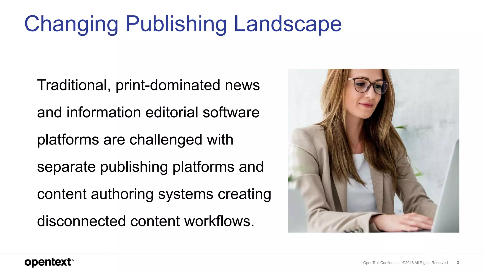 The document discusses the OpenText Content Hub for Publishers, designed to streamline the publishing process amidst a changing landscape where traditional platforms struggle with disconnection. This centralized solution enables authors, editors, and journalists to efficiently create, manage, and distribute content across print and digital channels while enhancing workflow and rights management. The hub offers various capabilities, including content reception, enrichment, creation, and syndication, aimed at supporting digital transformation and improving content value.