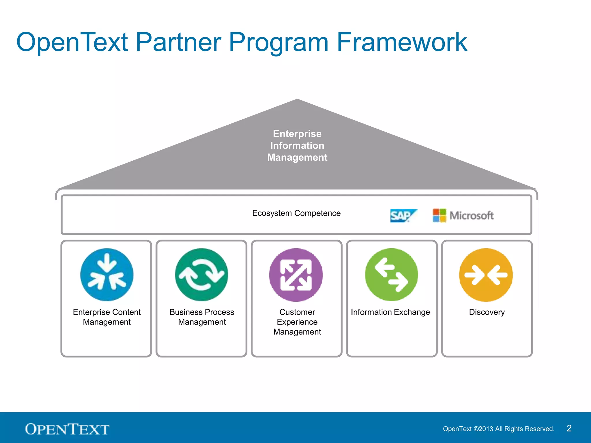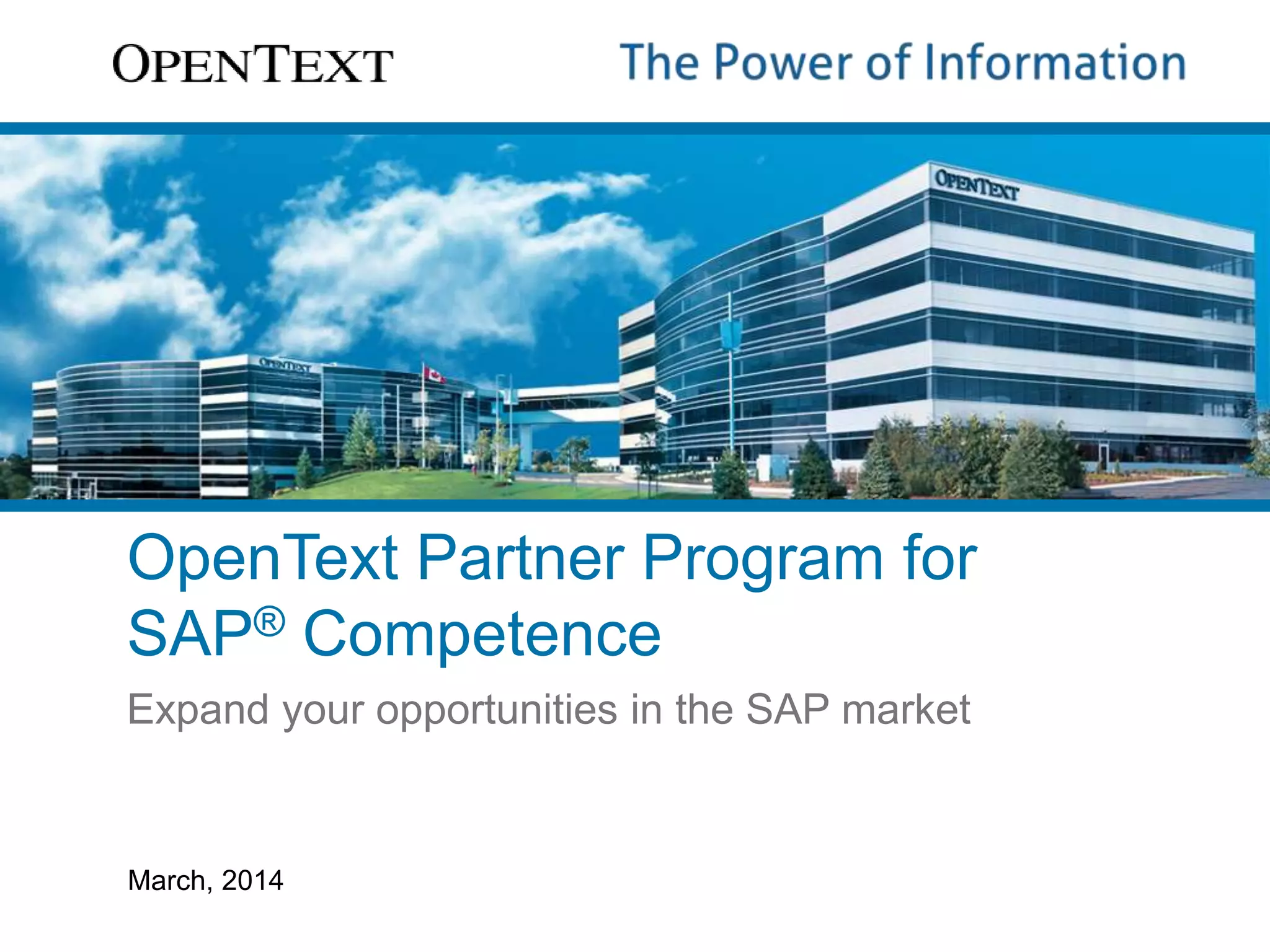 The OpenText Partner Program for SAP aims to enhance partner capabilities throughout the sales lifecycle, offering training, marketing support, and access to SAP experts. The program includes e-learning modules on sales, product features, and technical overviews, as well as various boot camps for technical certification. Partners benefit from ongoing enablement initiatives, networking events, and resources to increase visibility and sales potential in the SAP market.