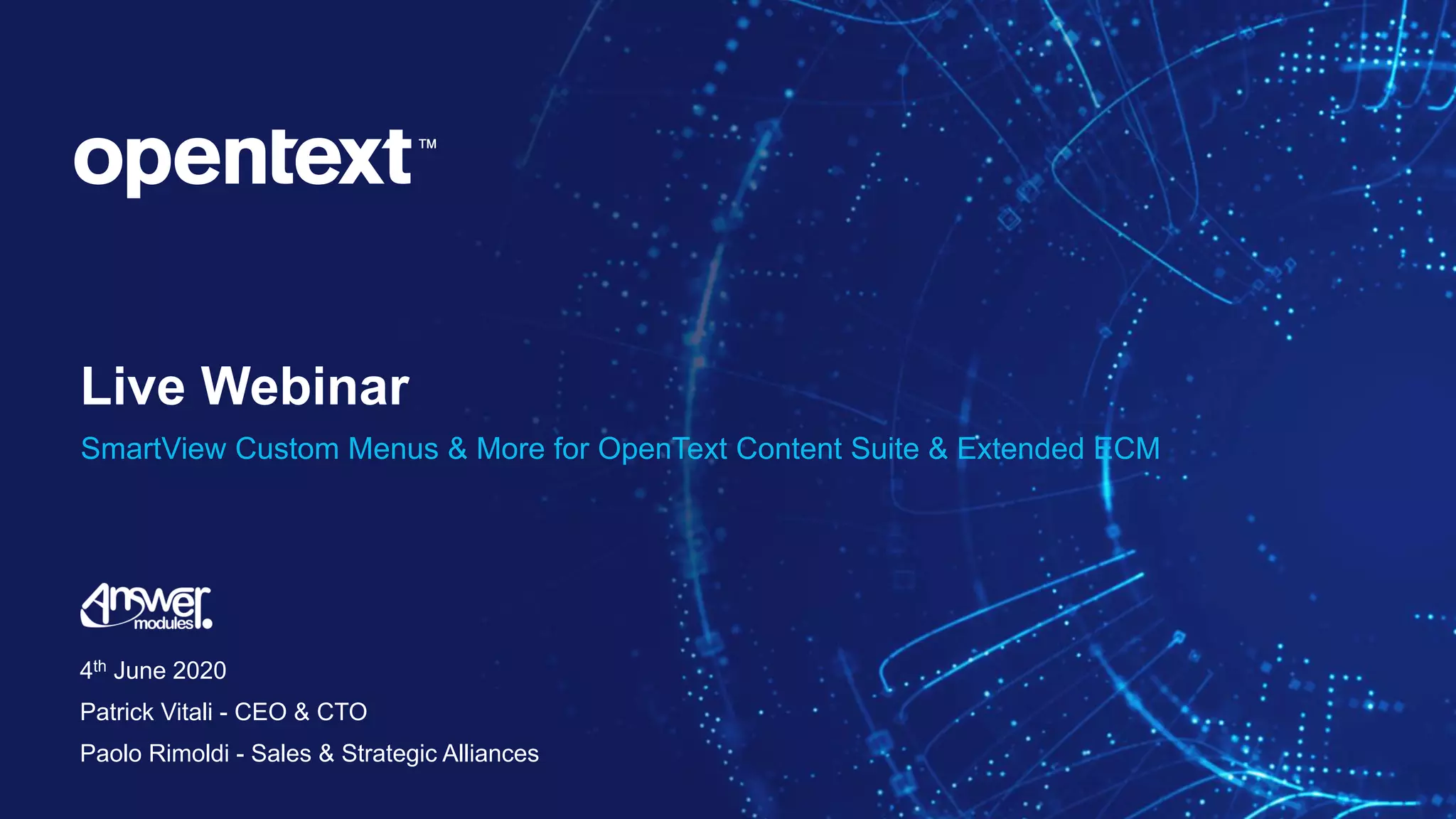 The document outlines a webinar hosted by OpenText on June 4th, 2020, showcasing the functionalities of the SmartView Module Suite, which enhances the Content Suite and Extended ECM capabilities. It highlights features such as low-coding development, custom workflows, and integrations with platforms like Zoom, enabling streamlined user interfaces and efficient project management. Additionally, it covers the importance of user-centered design and real-time configuration for tailored solutions in organizational processes.