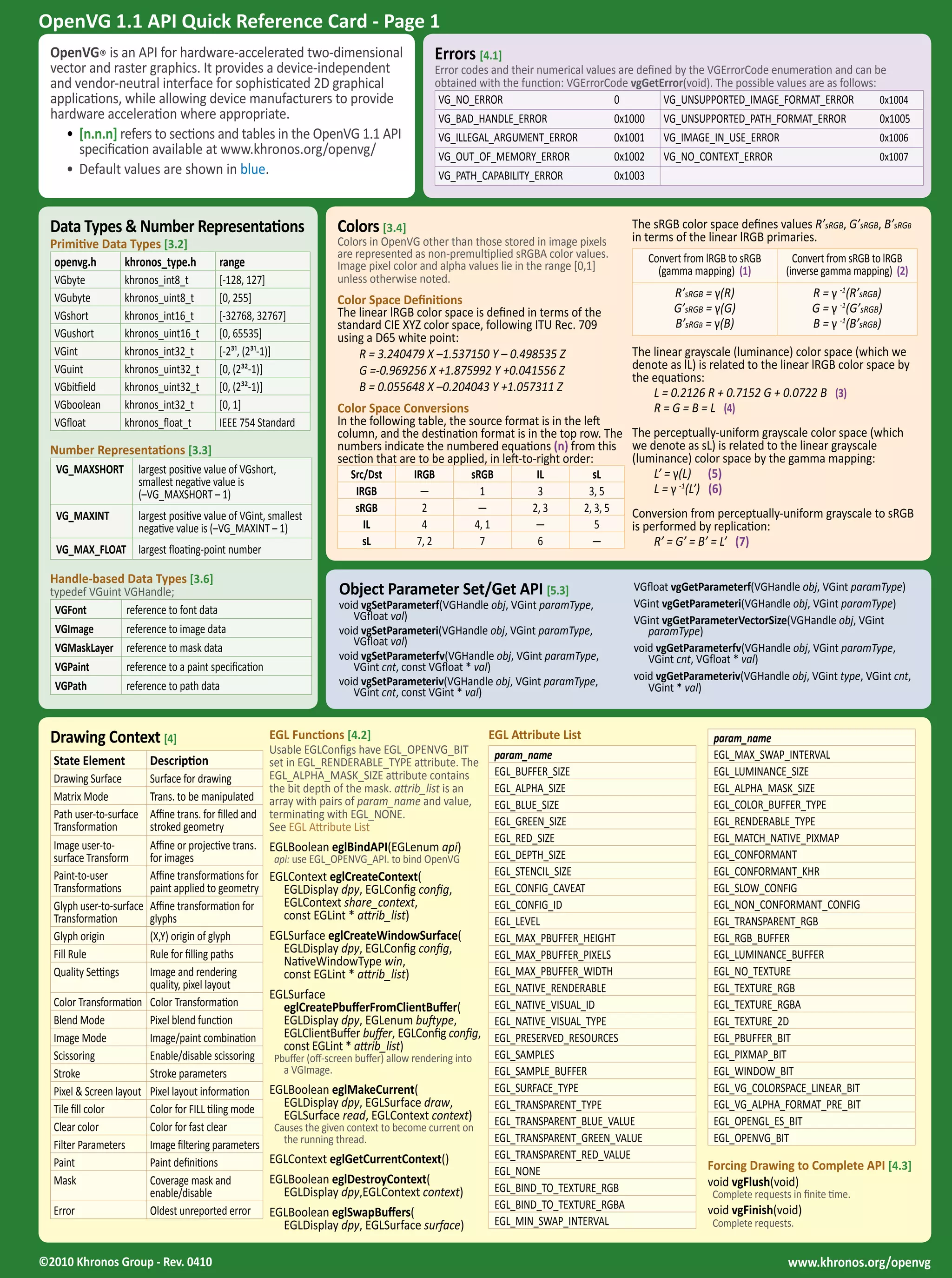 The document is an OpenVG 1.1 API quick reference card that provides summaries of key aspects of the OpenVG API, including: